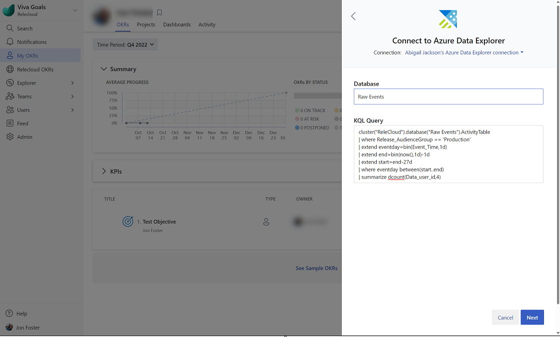 You can measure your OKRs progress by connecting your new or existing OKRs with an Azure Data Explorer database.