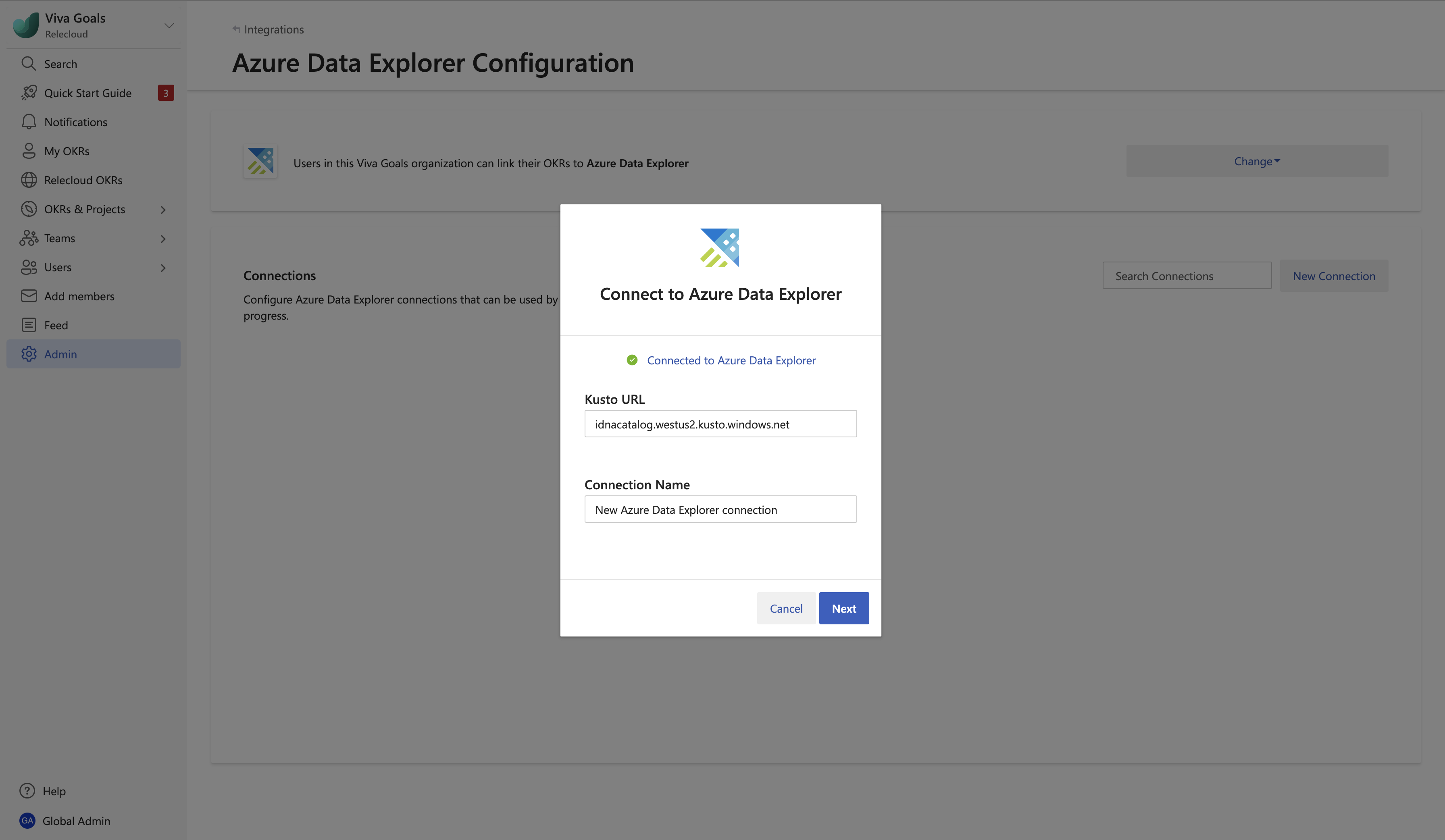 The first step in setting up the Azure Data Explorer integration is to set up a connection. This can be done by an admin or any user during the create/edit OKR process. If you’re a Viva Goals Organization admin: