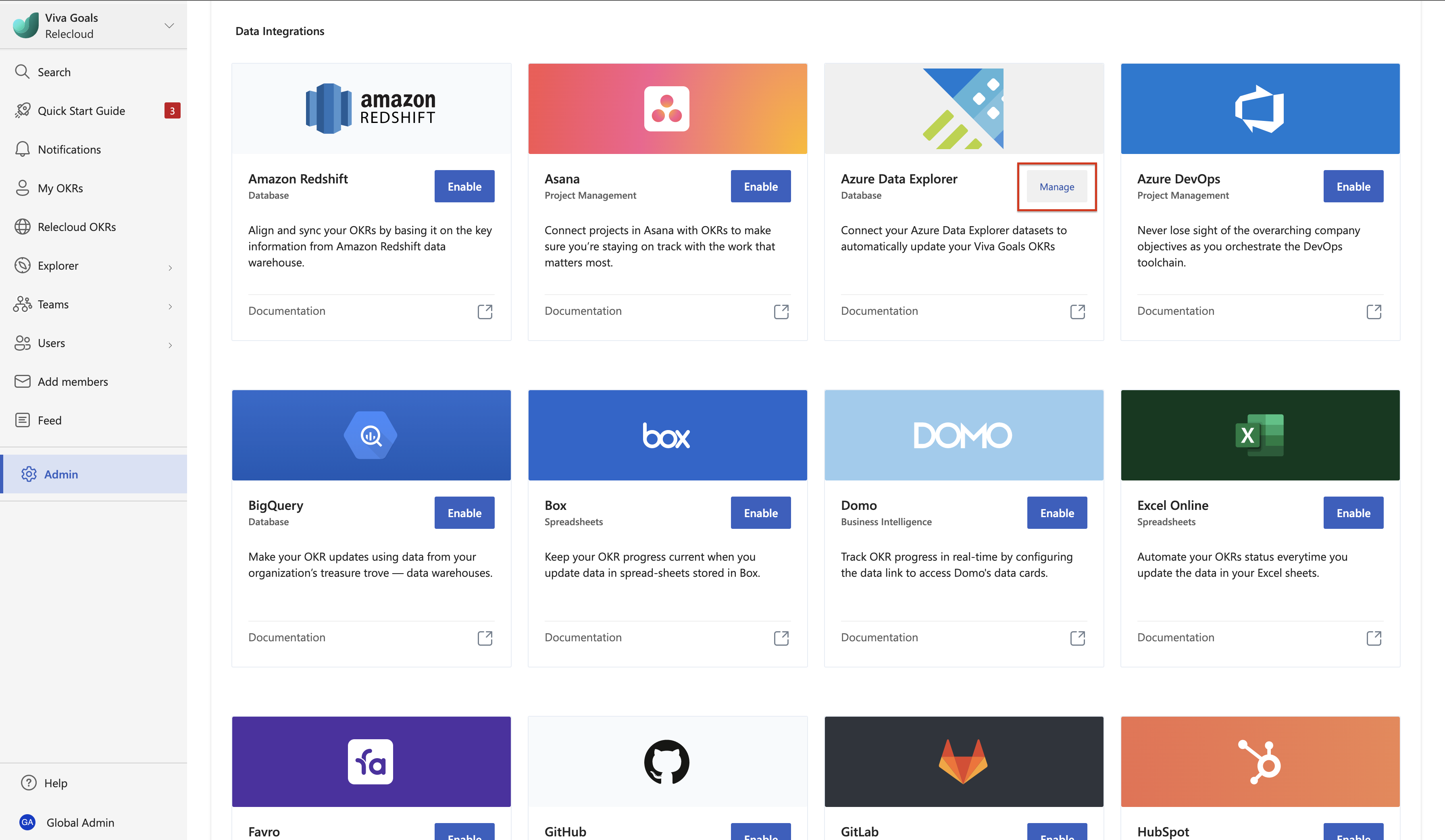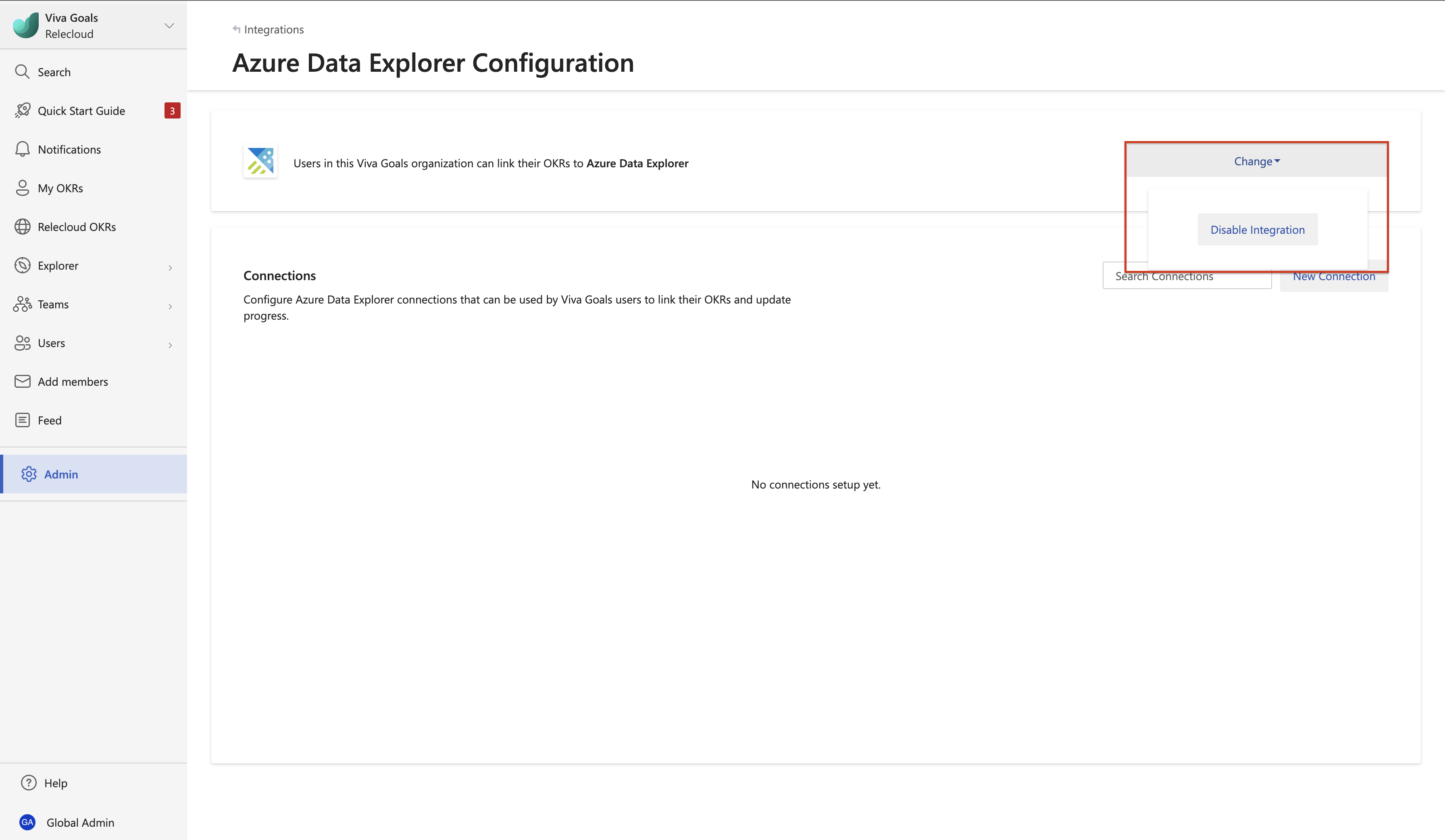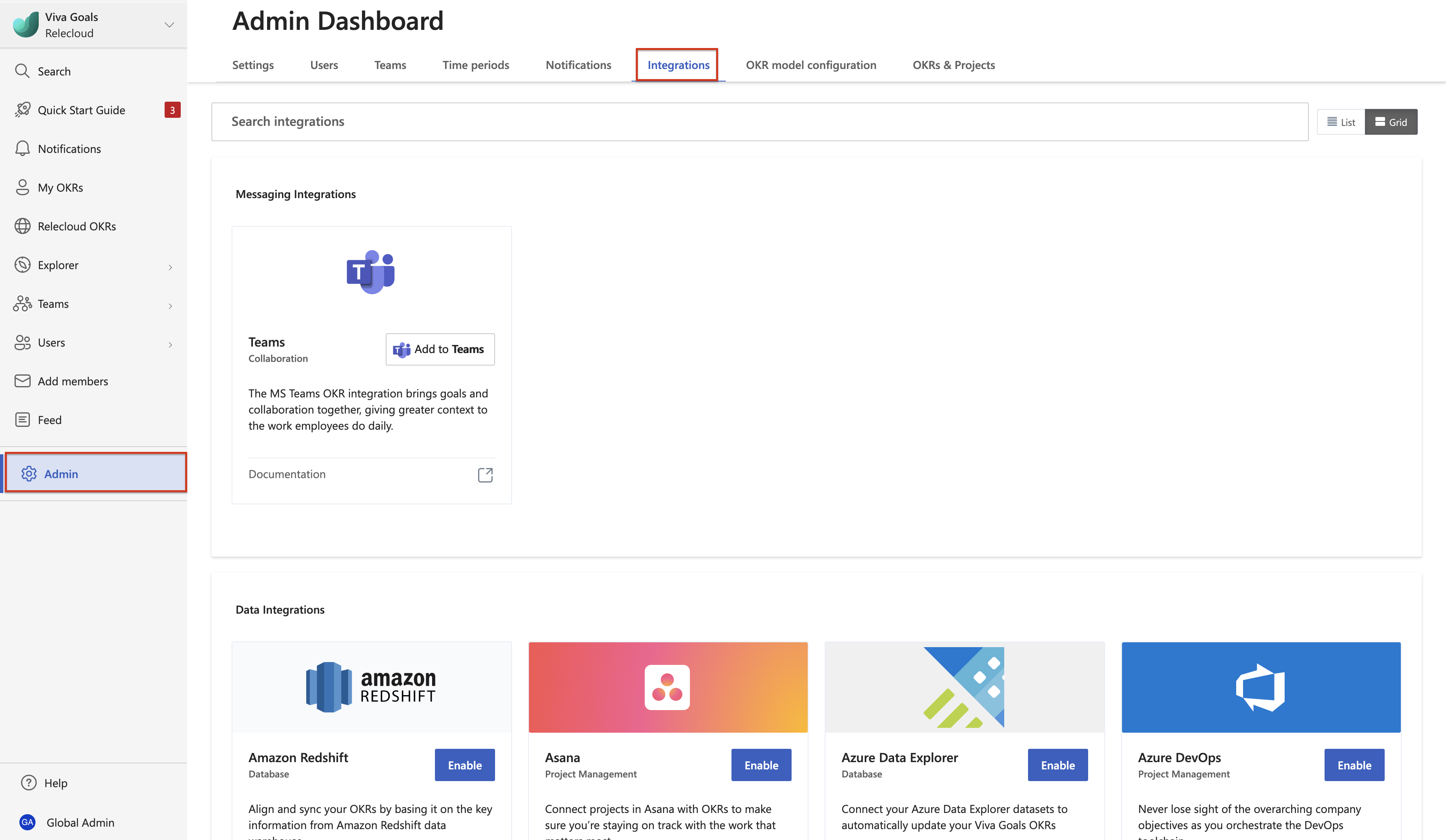 Admins also have permission to manage the integration from the admin dashboard. Once the integration is enabled for the Viva Goals instance, all users have access to this integration.