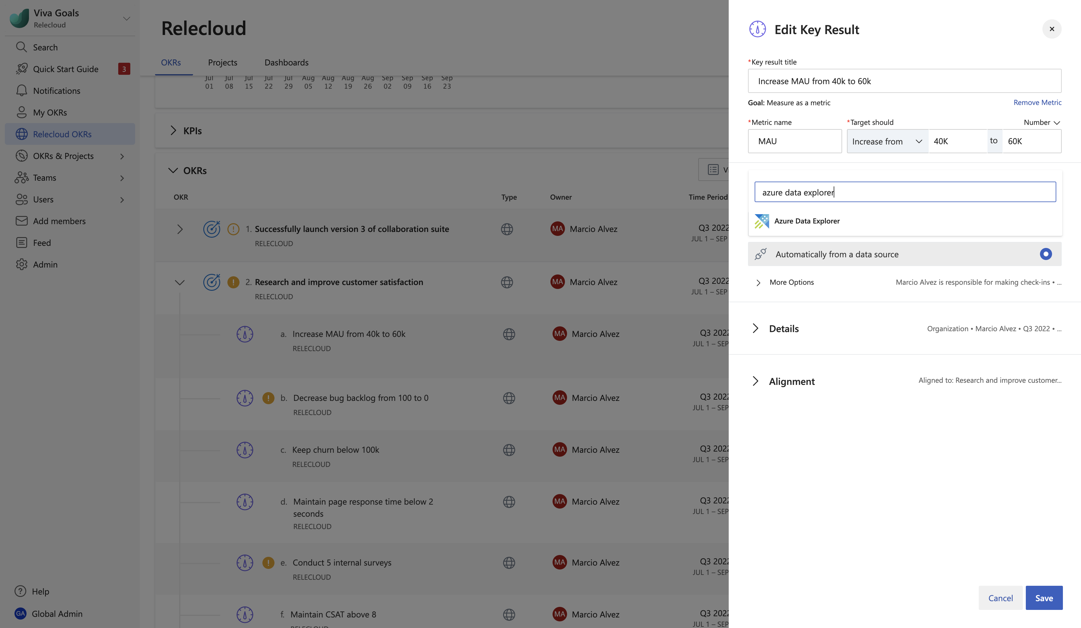 For example, if you have a Key Result to increase visits and the time spent in your app by 60%, then you can directly link this Key Result with the relevant data in Azure Data Explorer. This data is automatically synced with Viva Goals every hour. Whenever there's a change in the underlying dataset, the OKR status is updated.
