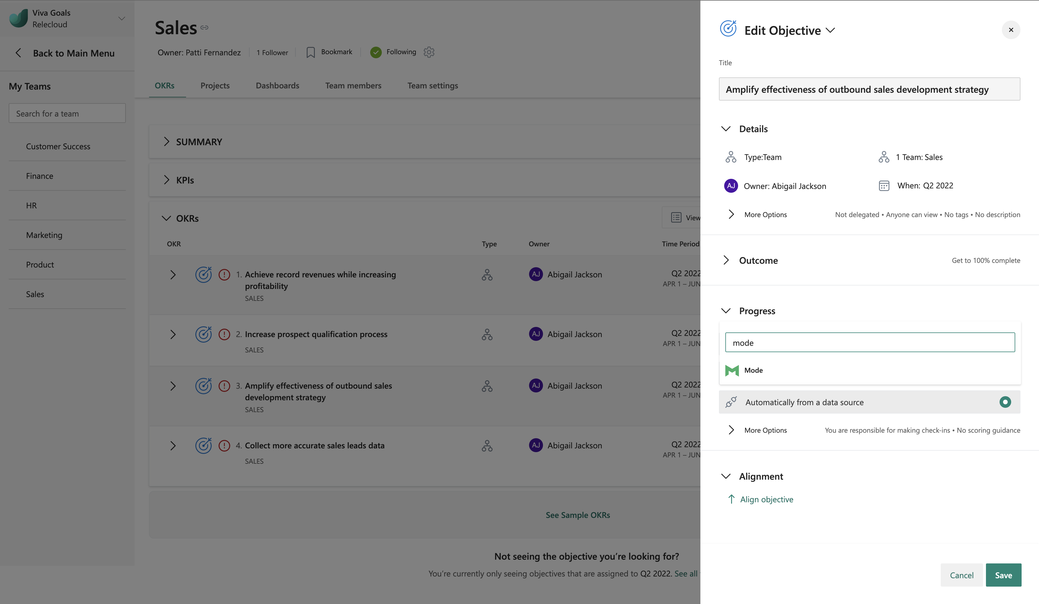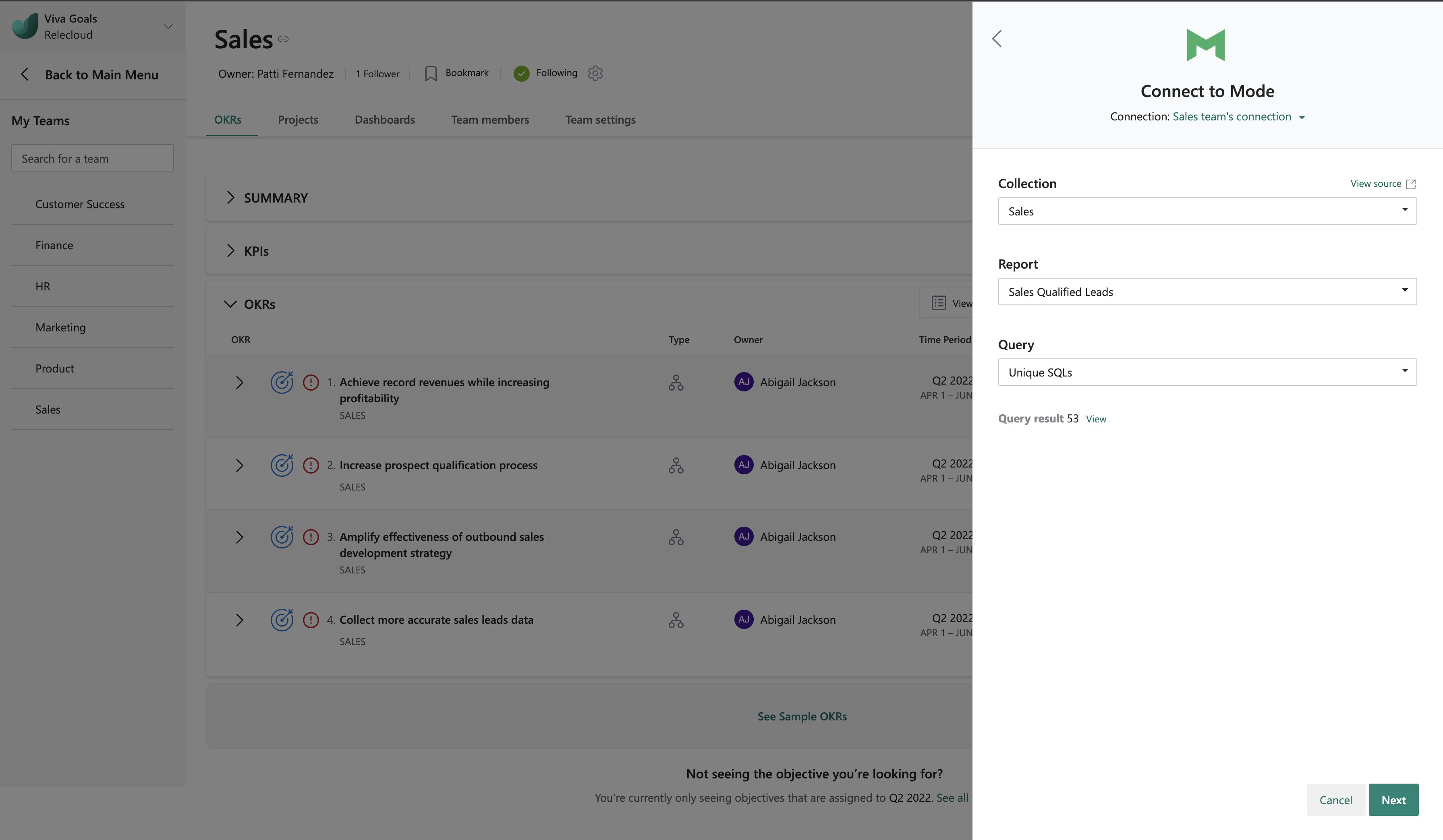 Viva Goals Mode integration lets you link your OKRs to reports in Mode for automatic real-time updates on your objectives.