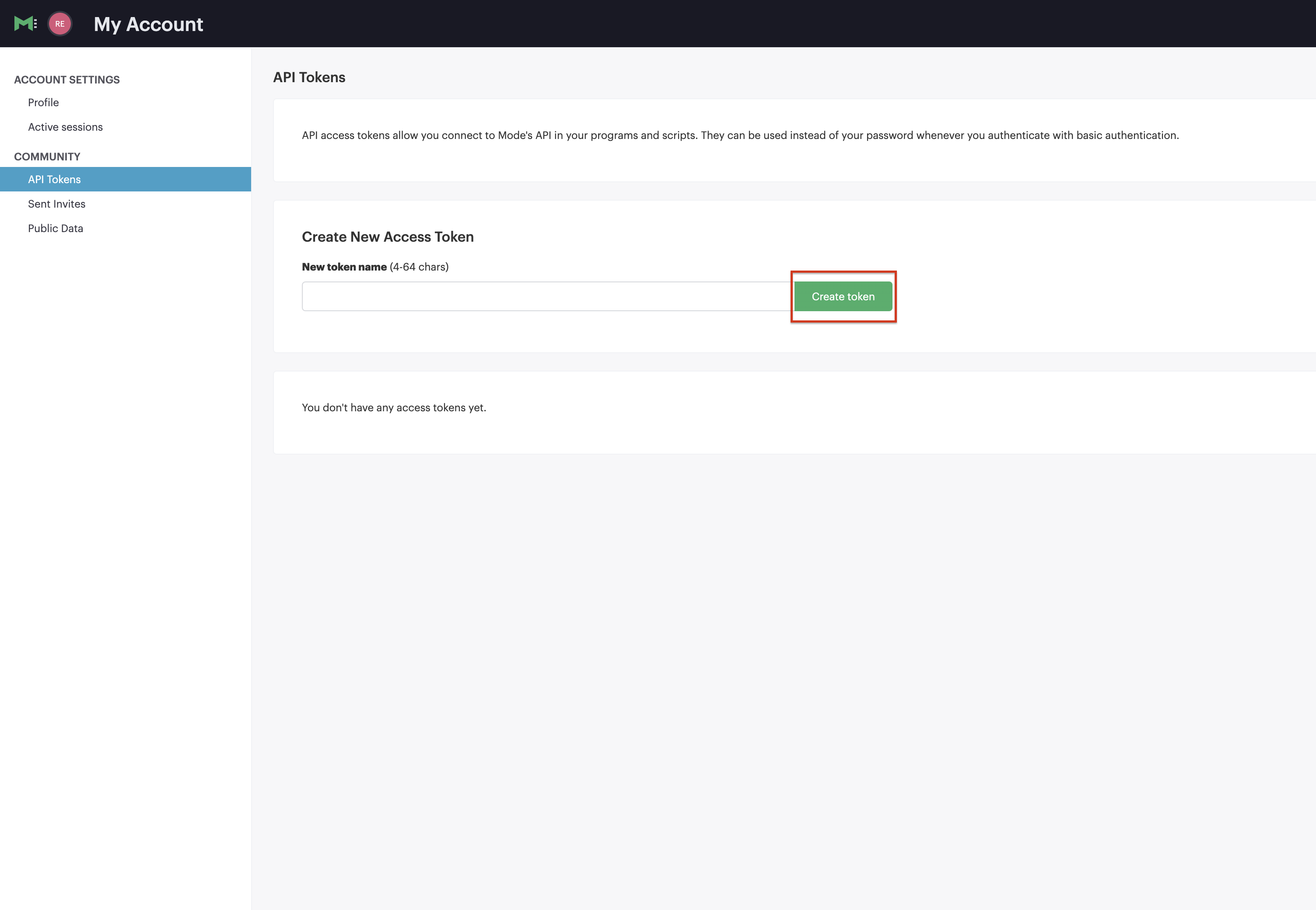 https://app.mode.com/home/relecloud/search, relecloud is the Workspace ID.To create your mode API token, select your profile and then select My Account Settings. On your account page, go to API Tokens under Community. Select Create token to create a new mode API token.