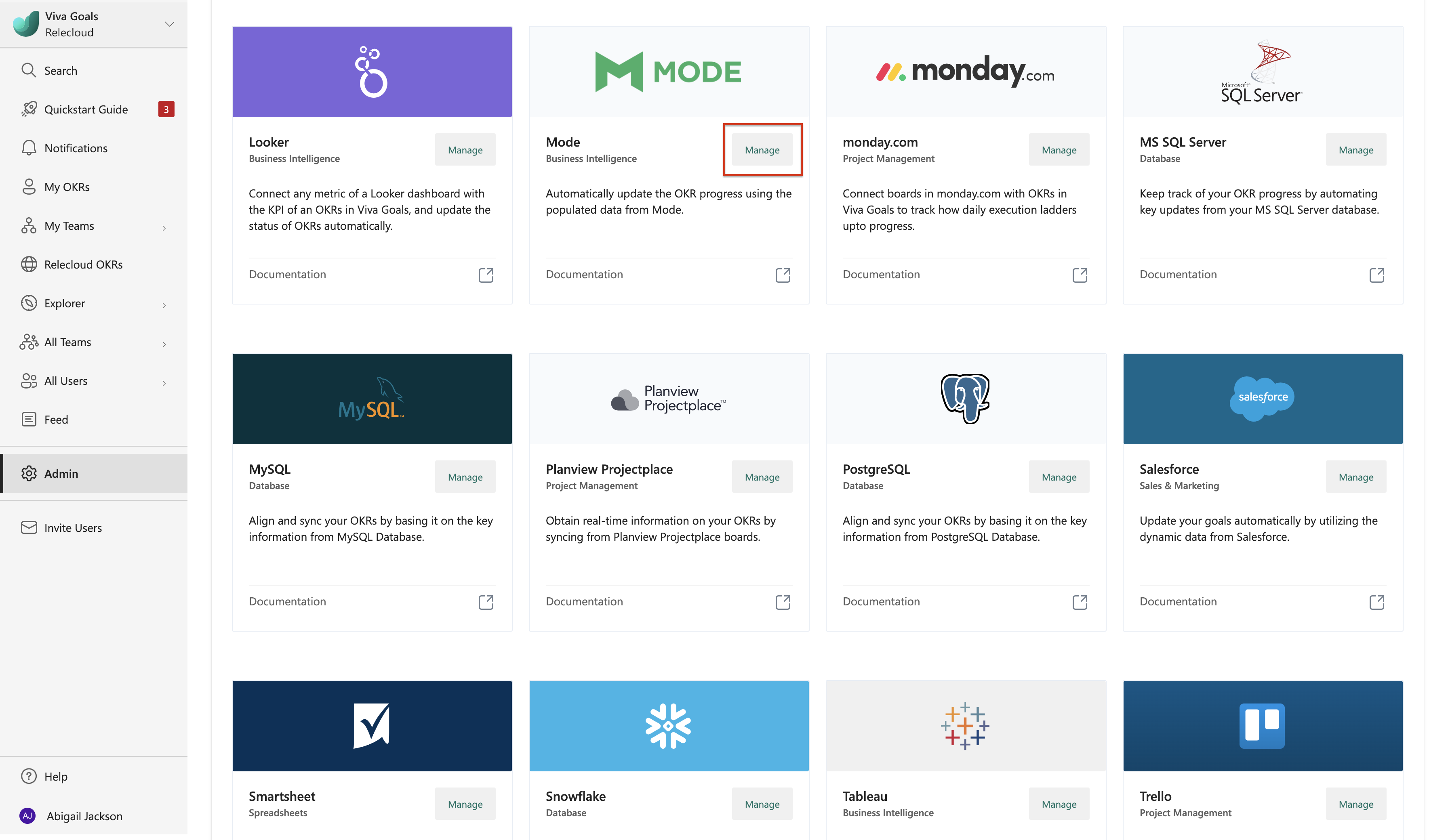The first step to set up the Mode integration is to connect your Mode account to Viva Goals. In the sidebar, select Admin and then Integrations.