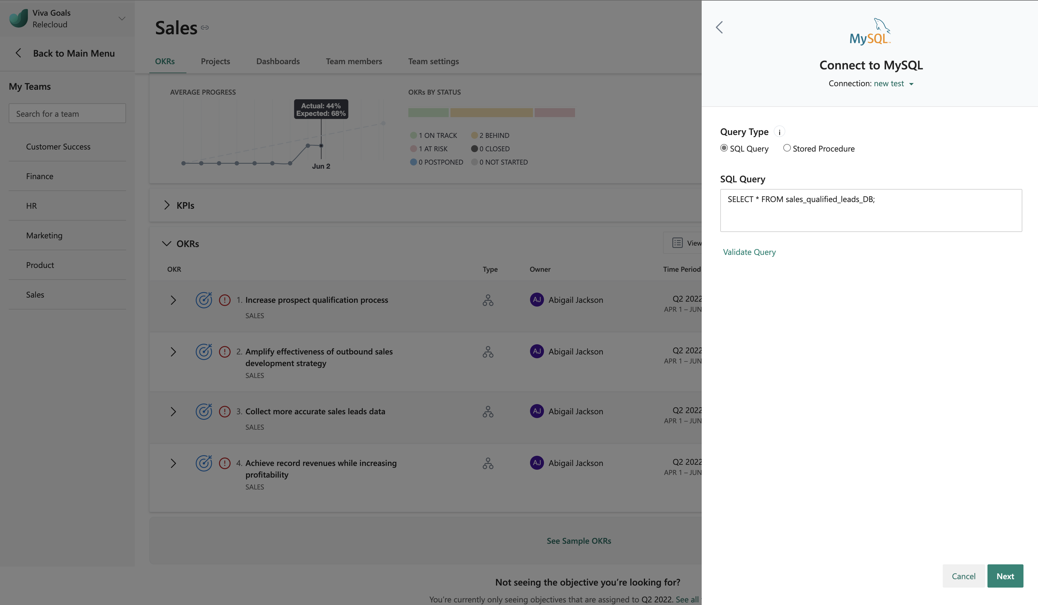 Let's consider this example: You use MySQL databases to store information on leads from multiple sources. You have an objective in Viva Goals to increase qualified leads by 40 percent every quarter. When you link this objective to the corresponding database in MySQL, the status of your OKR will be updated based on the data in your database. Viva Goals will automatically sync the values for you and chart your progress toward the goal, saving time while keeping your OKRs current.