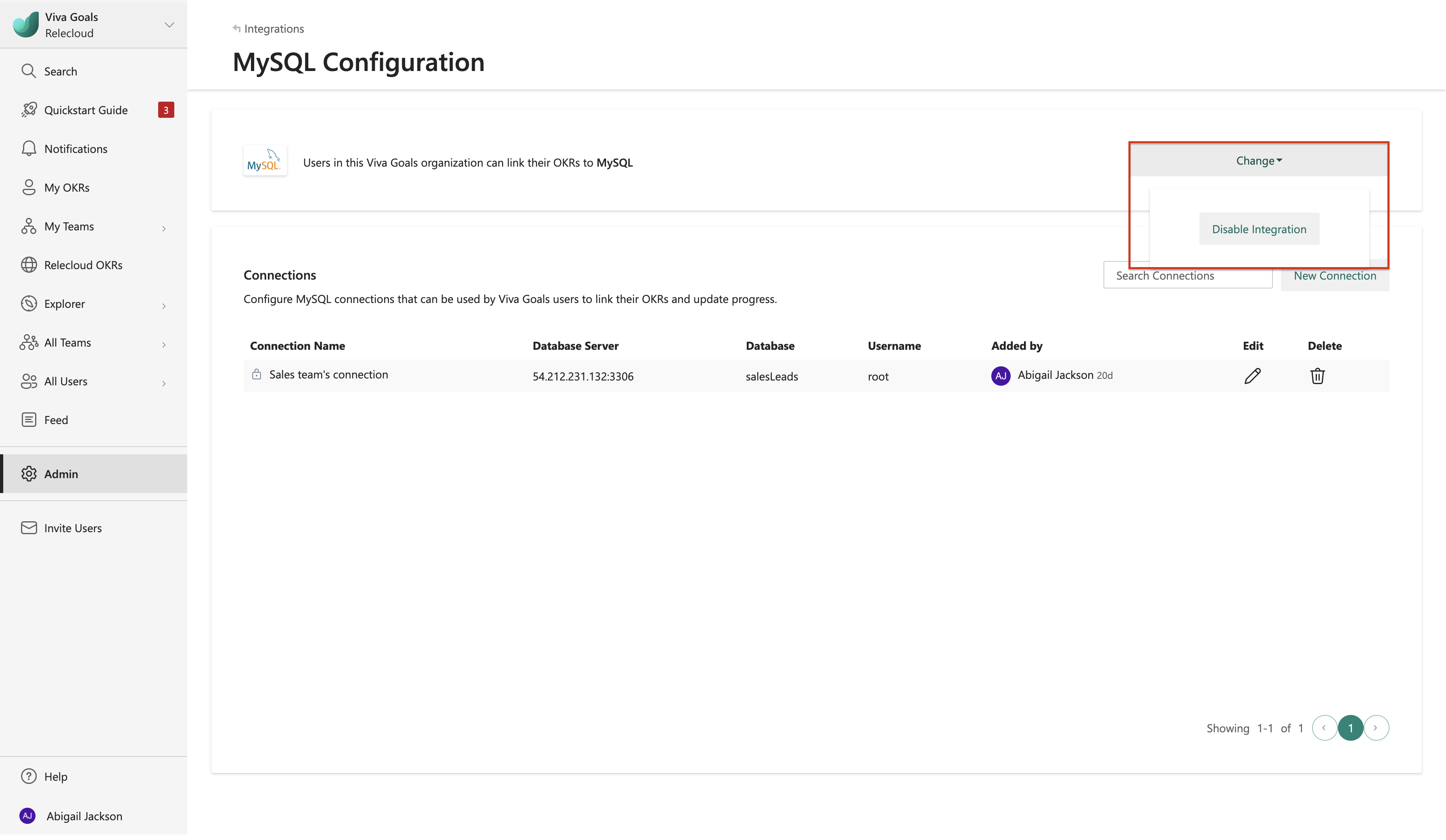 The Viva Goals MySQL integration lets you update your objectives and key result (OKR) progress automatically based on data in your MySQL database.