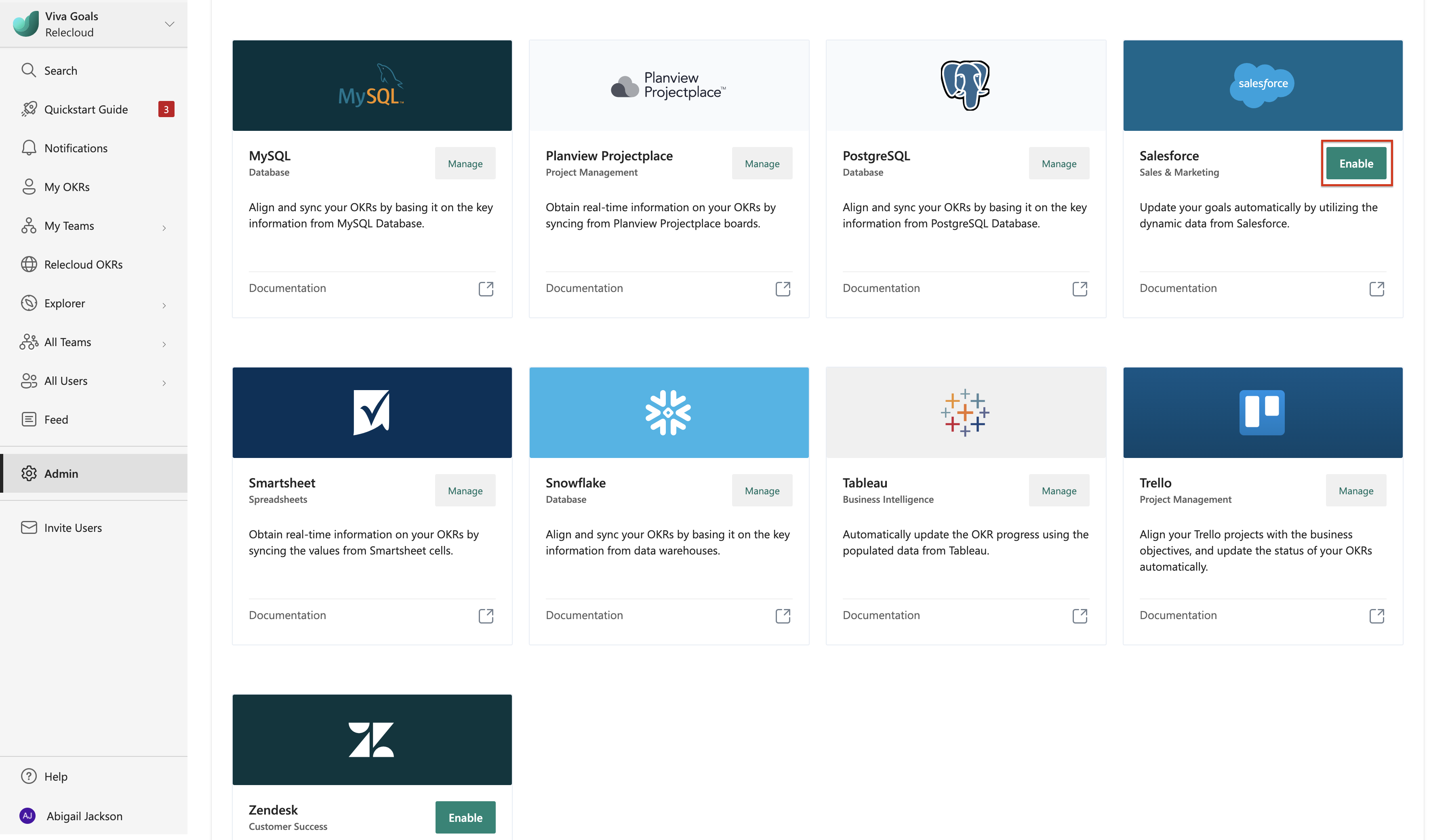 Go to the Viva Goals integrations page: Admin -> Integrations.