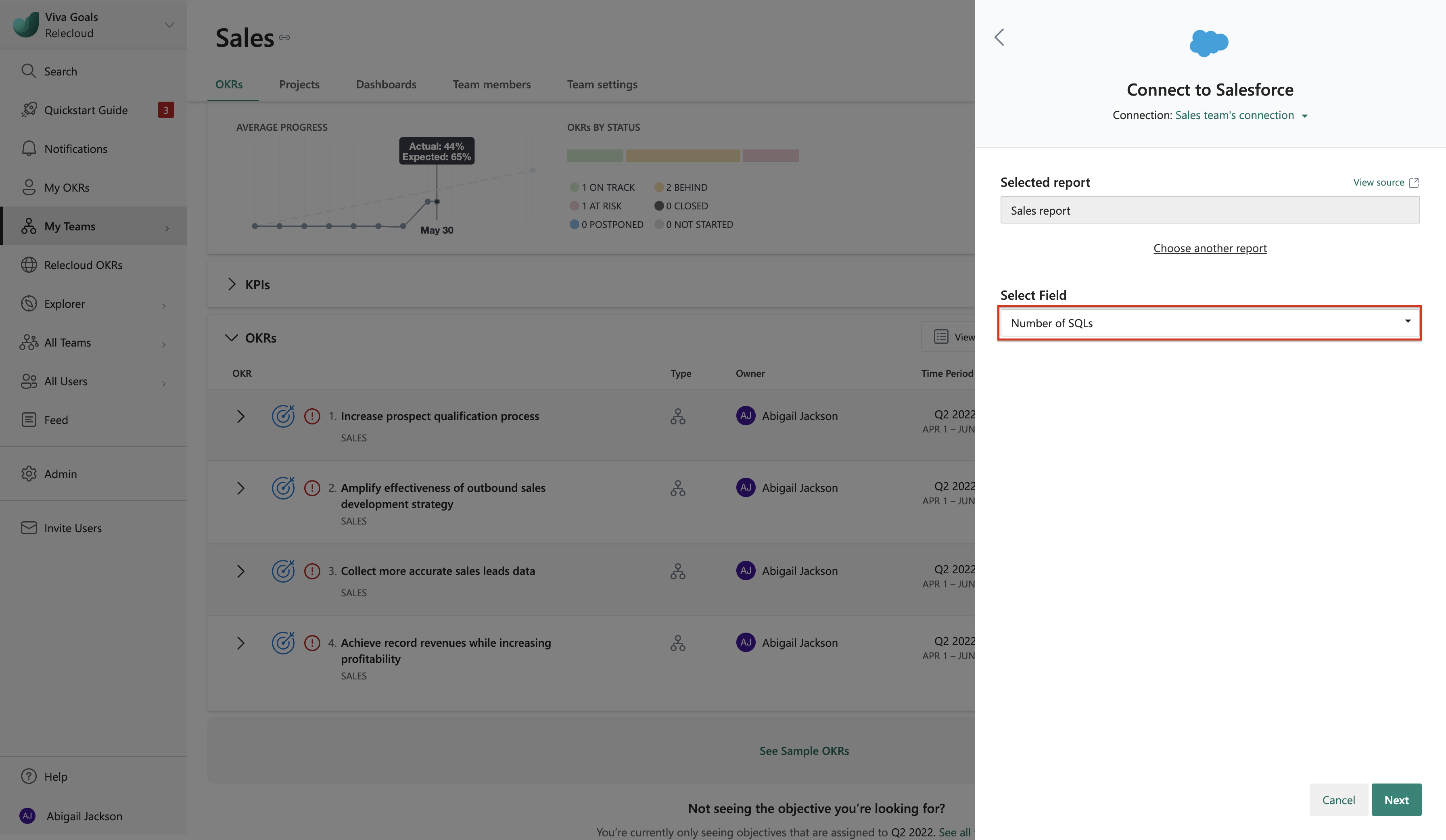 Viva Goals integrates with Salesforce lets you automatically update your objectives and key results (OKRs). For example, say you have a Salesforce report that tracks converted leads. You have a goal to increase the value of converted leads to a certain amount. Salesforce integration will automatically update your progress in Viva Goals.