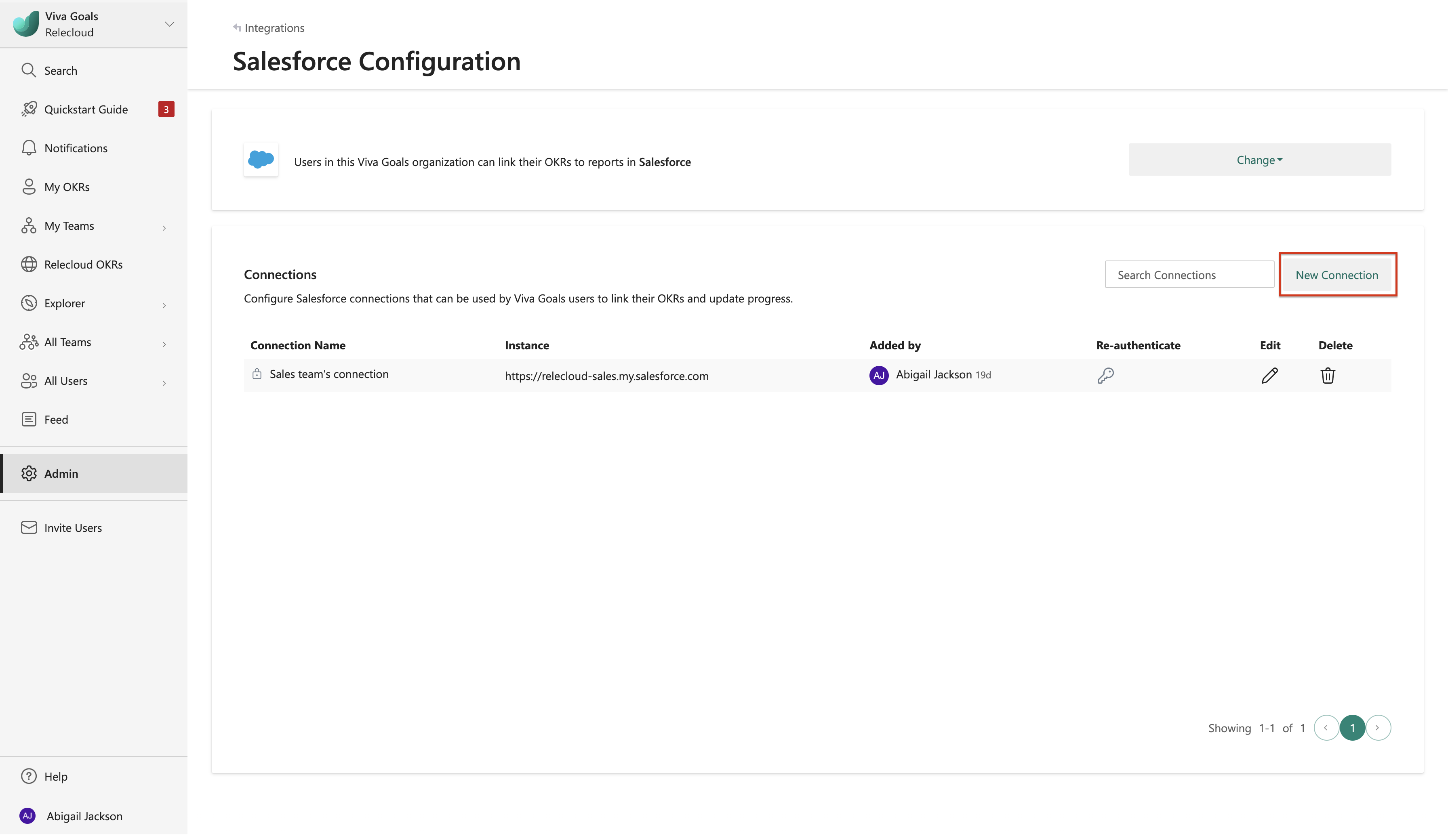 Viva Goals allows you to connect with multiple Salesforce accounts. Select New connection to add another account. You differentiate connections by name. The names are displayed to users when they link their OKRs to Salesforce reports.