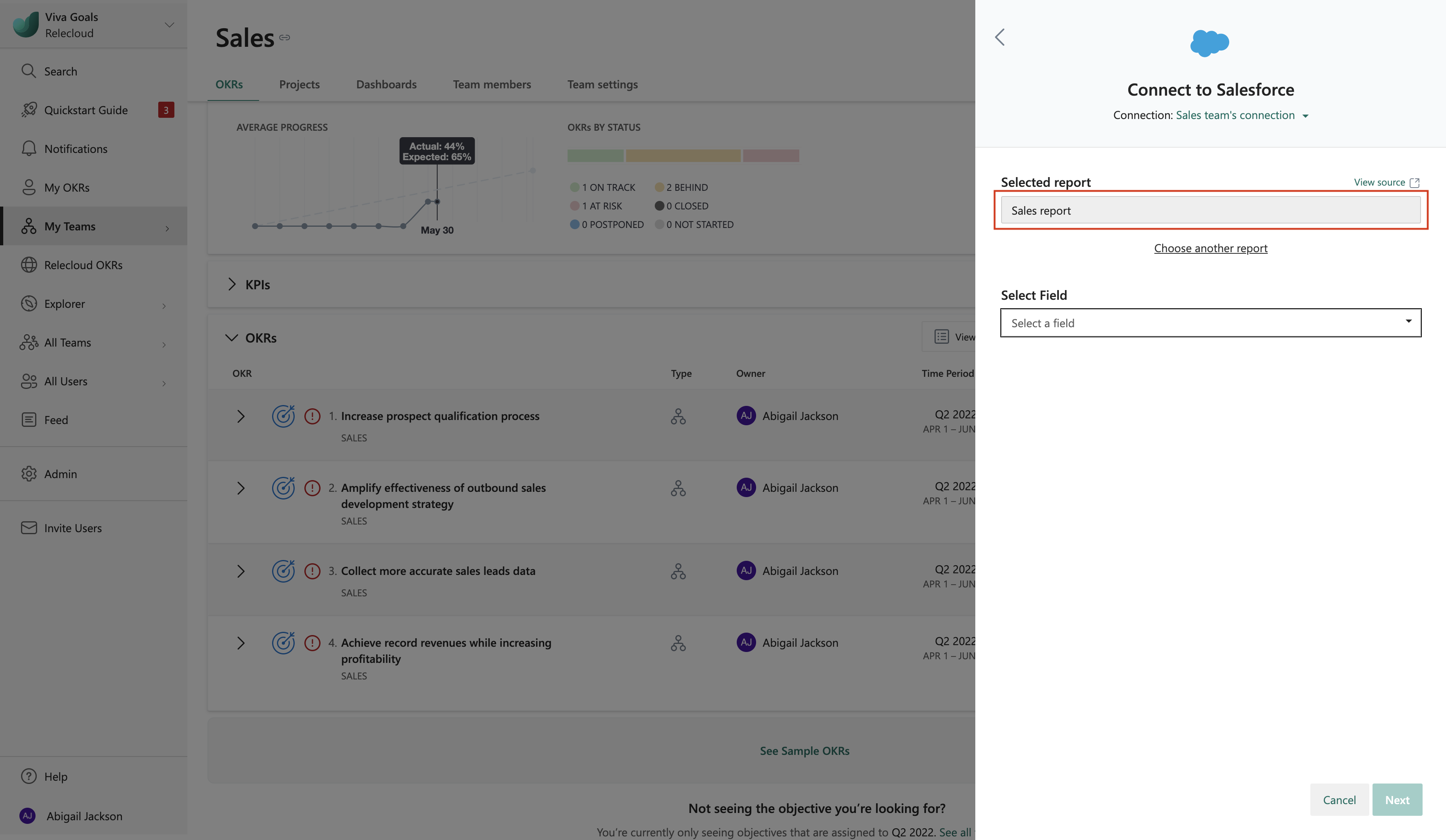 After setup is complete, users in your organization can link the success of their OKRs to fields in Salesforce reports.