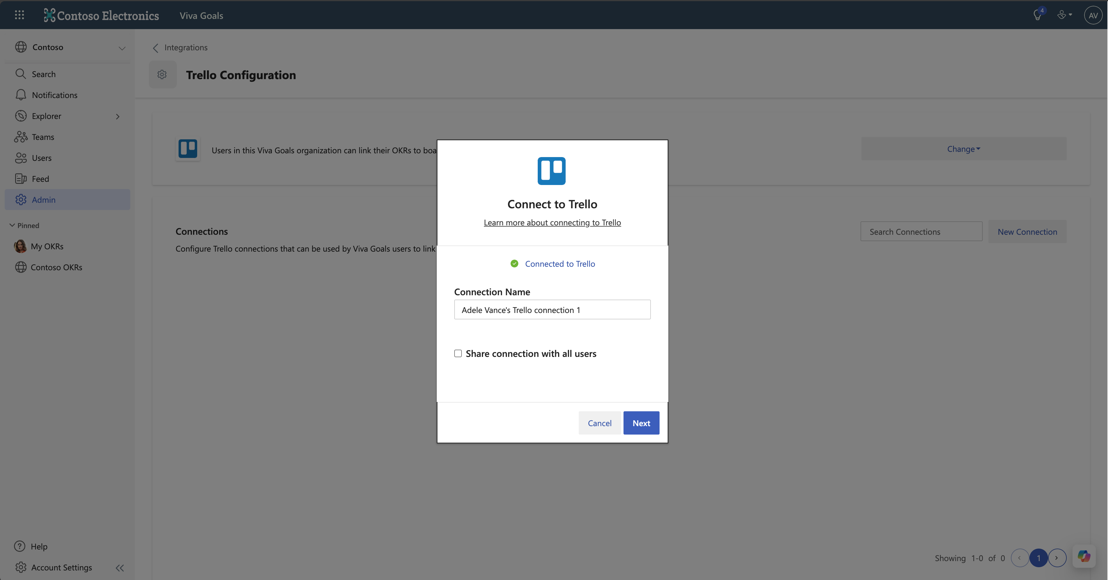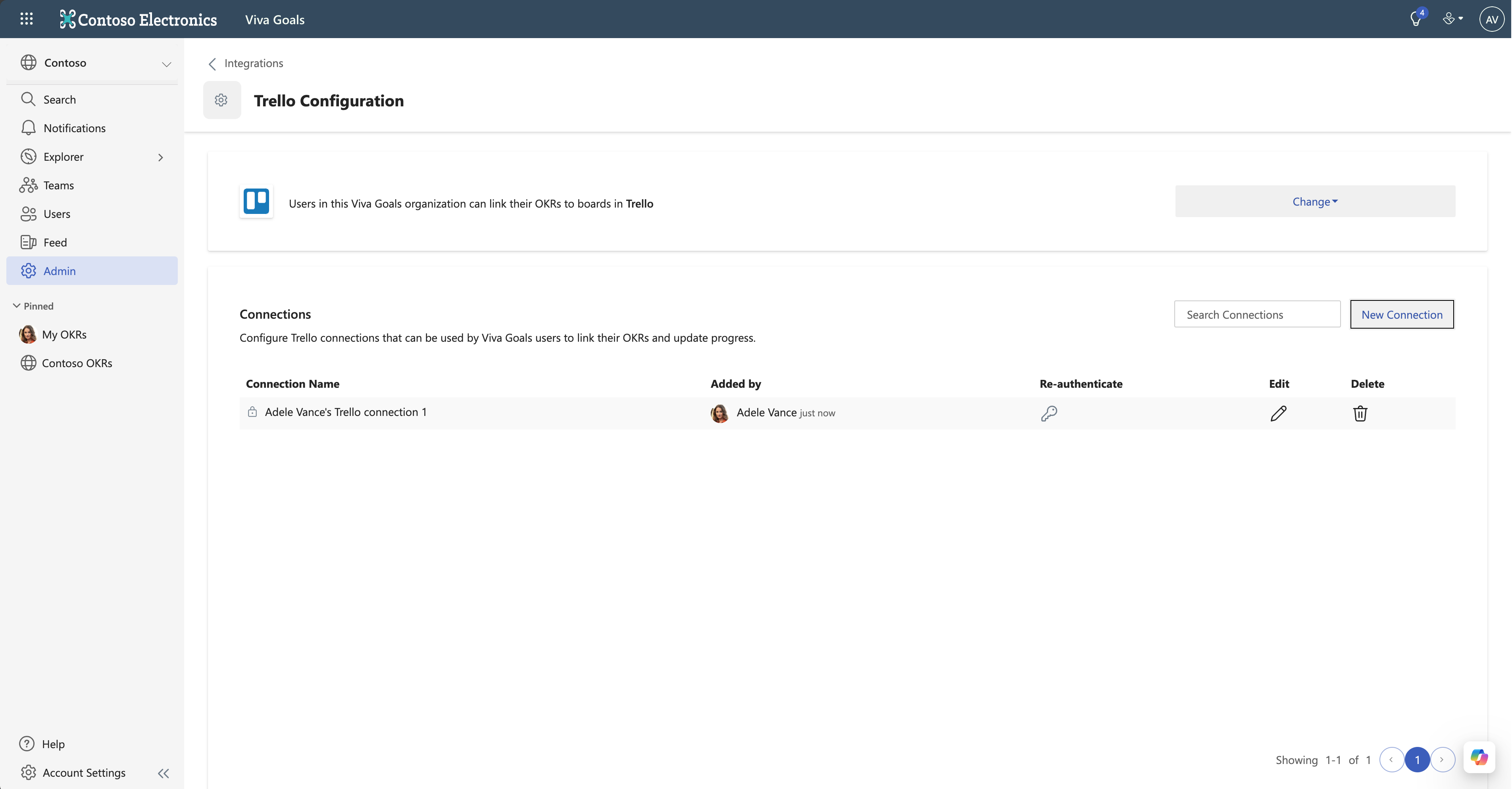 Viva Goals lets you connect with multiple Trello accounts. Select New Connection to add another connection. The connections are differentiated by name. These names are displayed to users when they link their key results to Trello boards.