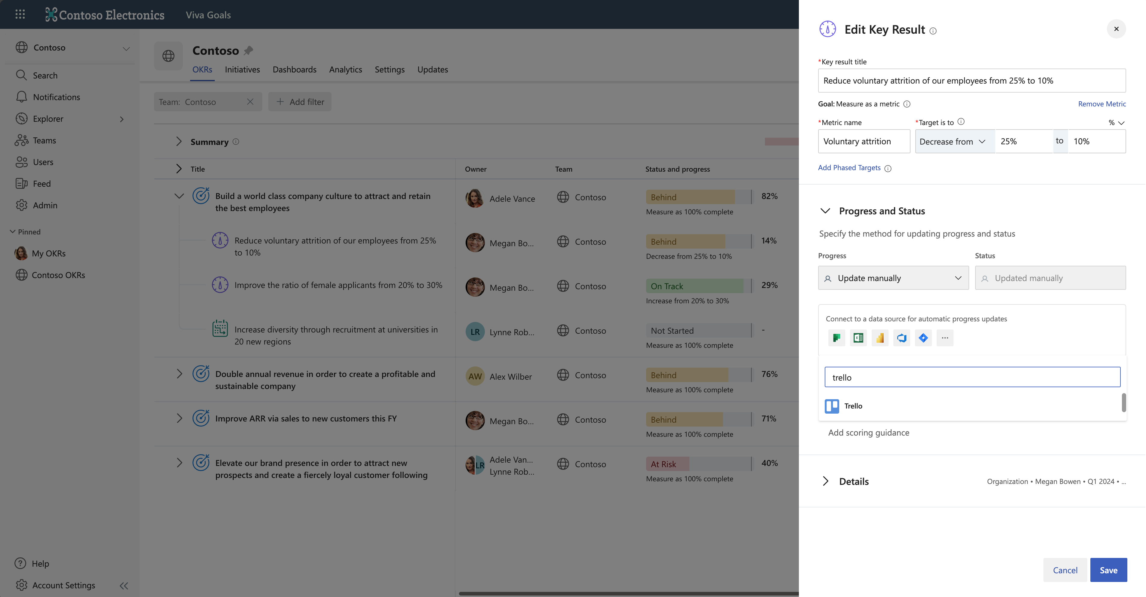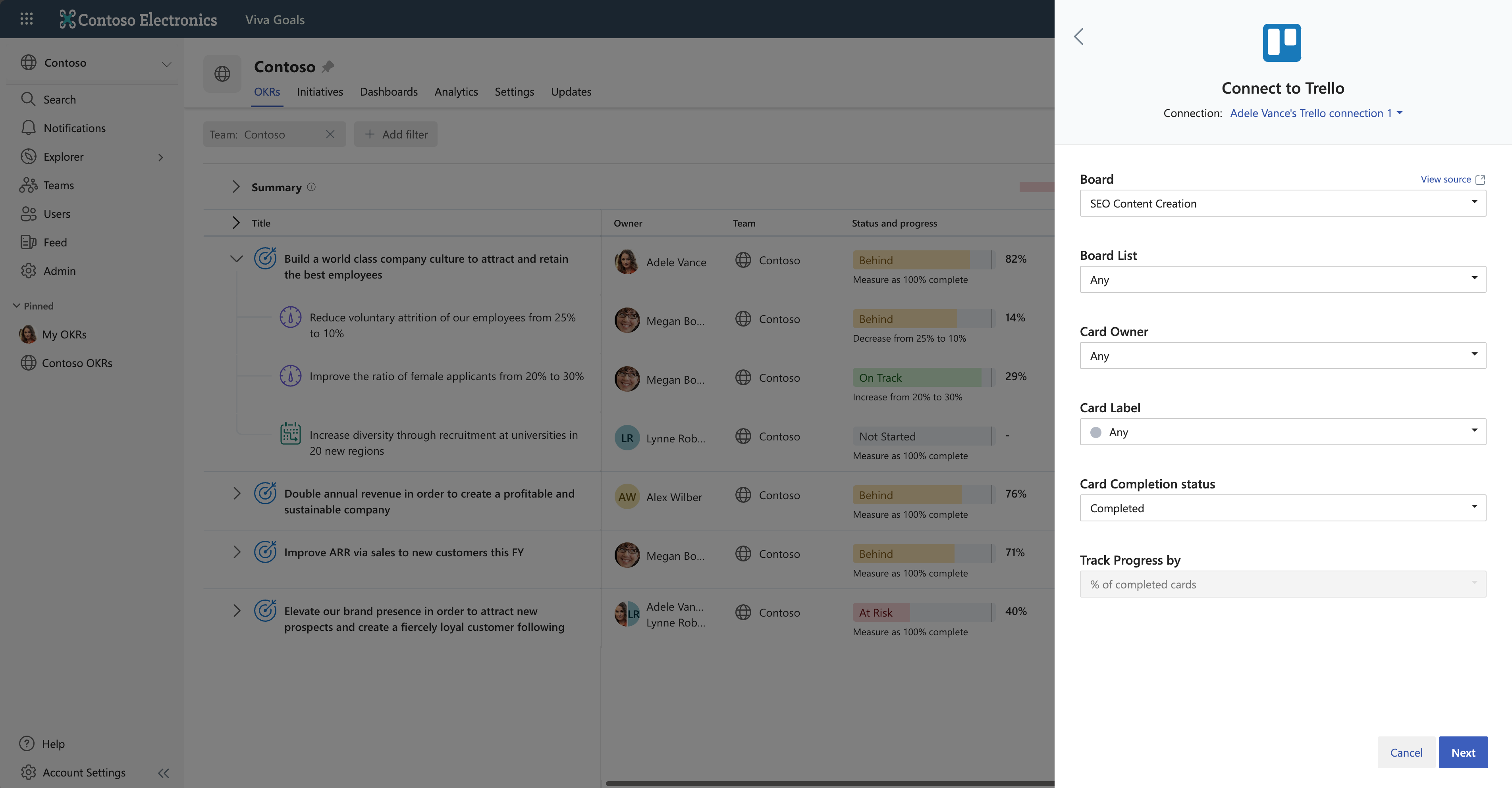 Viva Goals can integrate with Trello board to automatically update key results in Viva Goals. For example, let's say you're a marketer who uses a Trello board to keep track of blog posts you want to publish. Integrating with Trello would let you easily keep track of which posts have been completed from within Viva Goals.