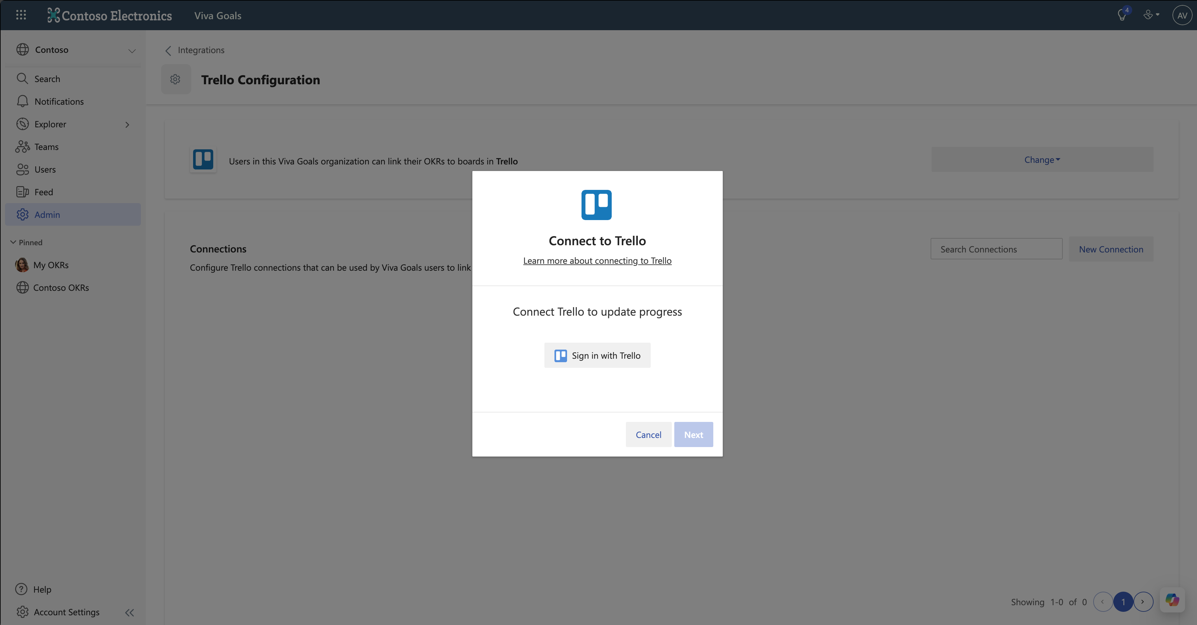 Select New Connection. In the dialog that follows, sign in to your Trello account. Next, configure Trello connections to link to your key results to update progress.