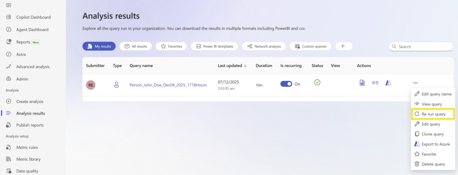 If a query is set to auto-refresh but you need updated results sooner - like after you change the metric rules or HR attributes - you don't need to wait for the next scheduled refresh. Instead, select Re-run query. For flexible queries, you can manually rerun these at any time by selecting Rerun in the results panel. Manual refresh, however, is not supported for one-click reports. Refer to the screenshot below: