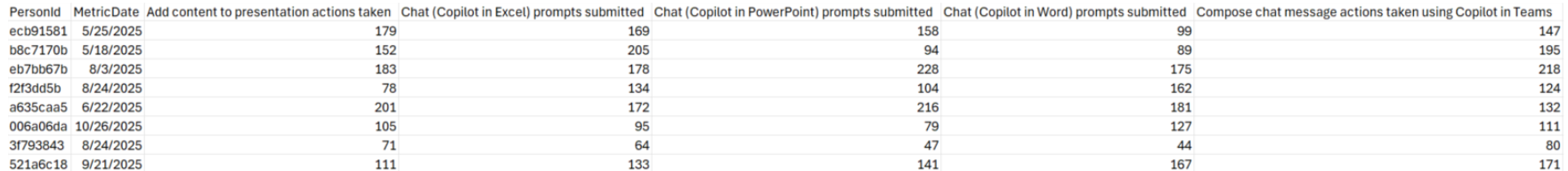 Exported data, however, includes additional metrics – such as Copilot Chat (without license) and usage intensity metrics – that can help deepen your understanding of Copilot adoption and support AI transformation across your organization.