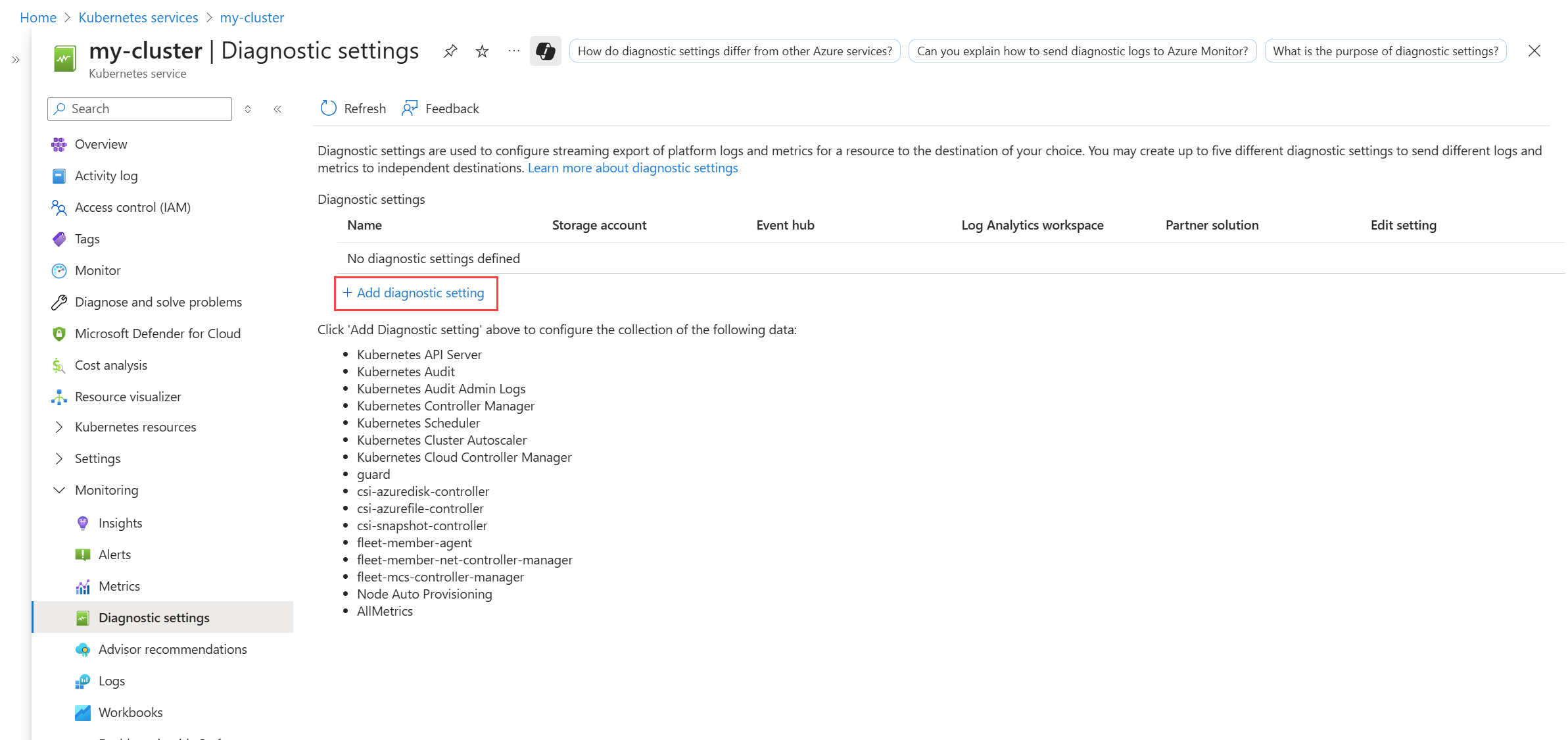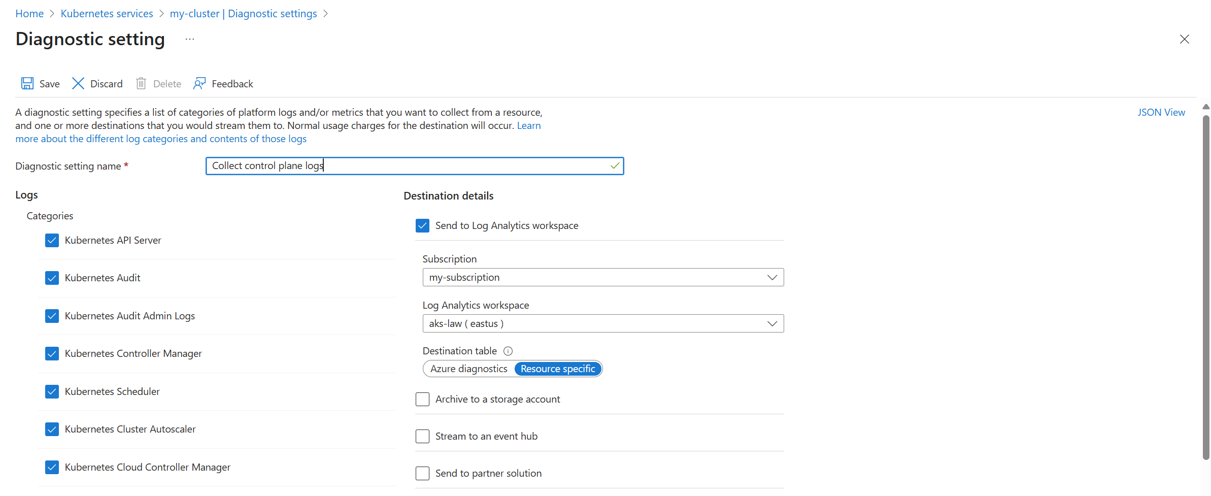 I log del piano di controllo vengono implementati come log delle risorse in Monitoraggio di Azure. Per raccogliere questi log, creare un'impostazione di diagnostica per il cluster. Inviarli alla stessa area di lavoro Log Analytics dei log dei contenitori.