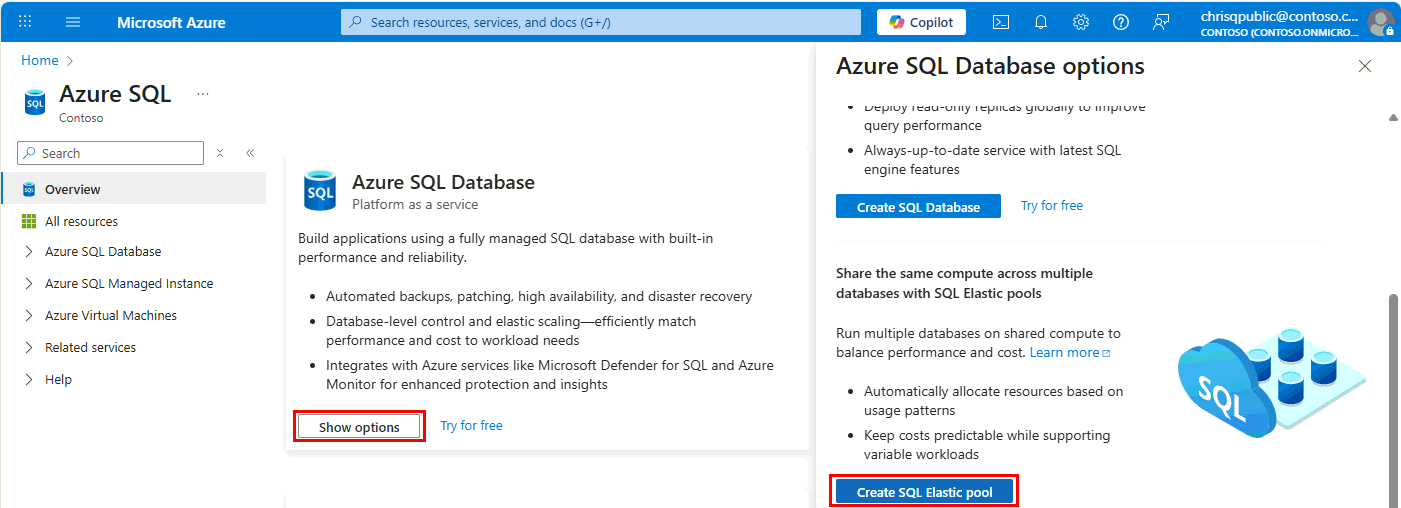 Nella finestra Opzioni del database SQL di Azure selezionare Crea pool elastico SQL.