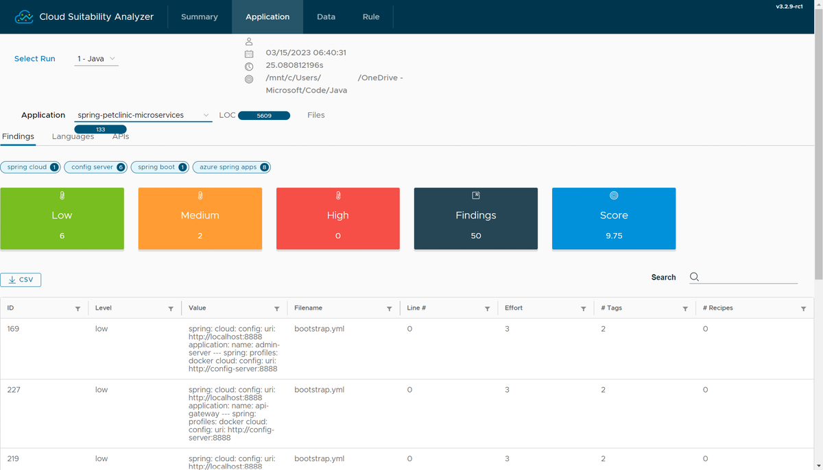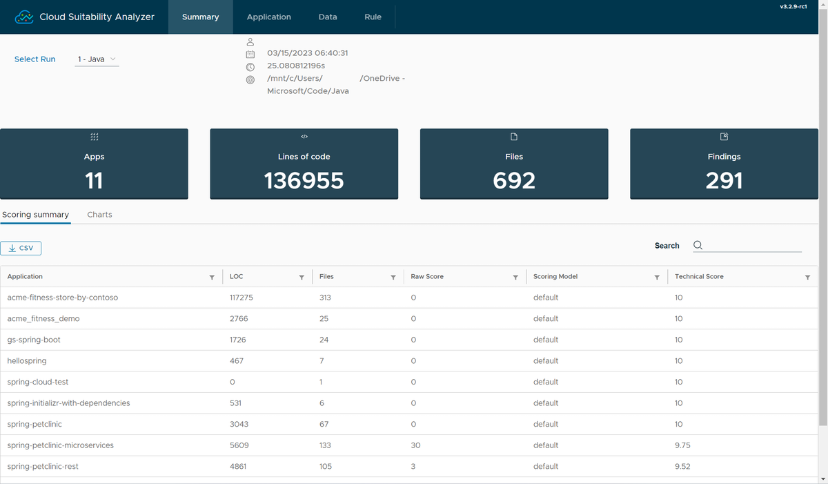 L'analizzatore idoneità cloud stima l'idoneità delle applicazioni Spring rispetto alle piattaforme cloud confrontando i modelli rispetto al codice sorgente. Lo strumento assegna ogni problema a un punteggio non elaborato in base a un set di regole predefinite o personalizzate. Lo strumento calcola quindi un punteggio tecnico compreso tra 0 e 10 per ogni applicazione in base alla somma dei punteggi non elaborati. Più cloud-ready un'applicazione è il punteggio tecnico più alto.