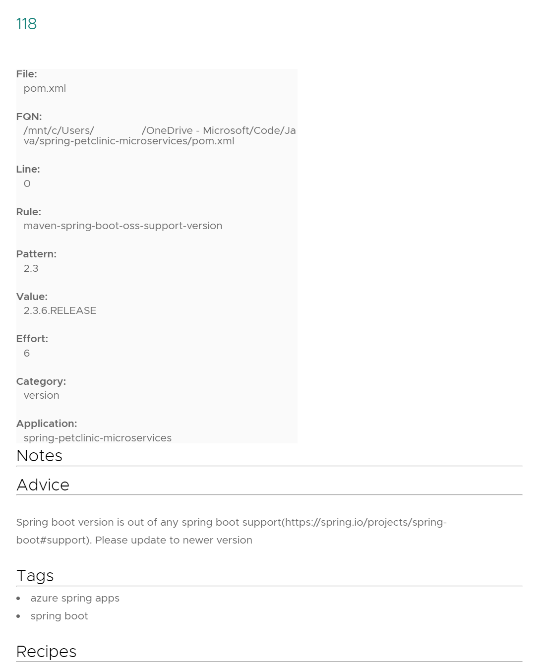Nella pagina Applicazione è possibile selezionare l'ID di un problema per visualizzare informazioni dettagliate e azioni suggerite. Queste informazioni includono il percorso del file di codice sorgente con il problema trovato, il modello corrispondente al problema e la regola che descrive il criterio e il punteggio di sforzo. Nella sezione Consigli è possibile trovare la spiegazione specifica del problema trovato e l'azione corrispondente suggerita.