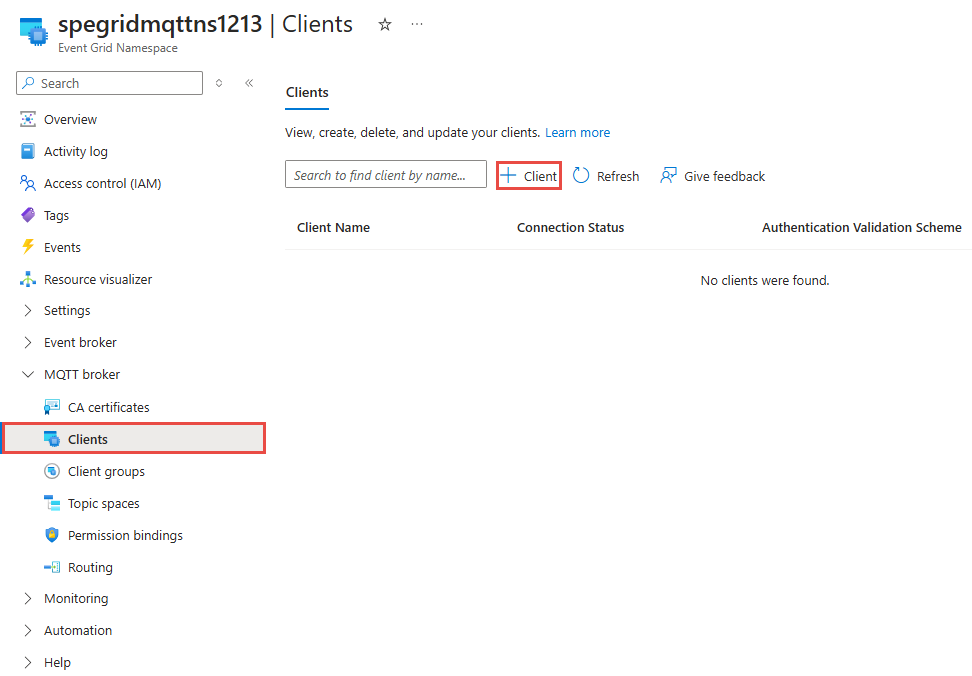In questo argomento di avvio rapido si userà il portale di Azure per creare uno spazio dei nomi di Griglia di eventi con il broker MQTT abilitato, creare sotto-risorse come client, gruppi client e spazi argomento, concedere ai client l'accesso a spazi di pubblicazione e sottoscrizione agli spazi degli argomenti e quindi pubblicare e ricevere messaggi tra i client.