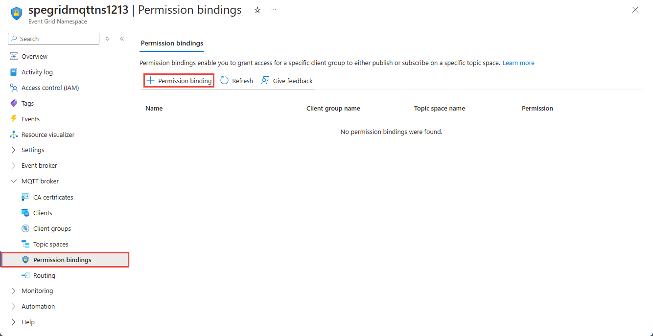contososubscriberbinding) selezionando + Associazione di autorizzazioni sulla barra degli strumenti.Specificare un nome e assegnare $all'accesso al Sottoscrittore del gruppo client a ContosoTopicSpace, come illustrato.