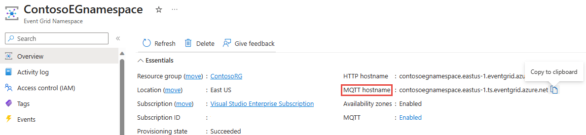 Aggiornare il nome host al nome host MQTT dalla pagina Panoramica dello spazio dei nomi.