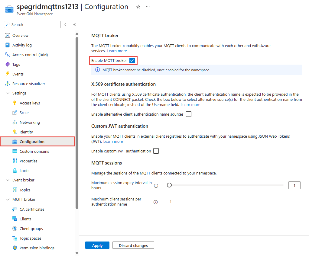 Nella pagina Configurazione selezionare l'opzione Abilita broker MQTT e quindi selezionare Applica per applicare le impostazioni.