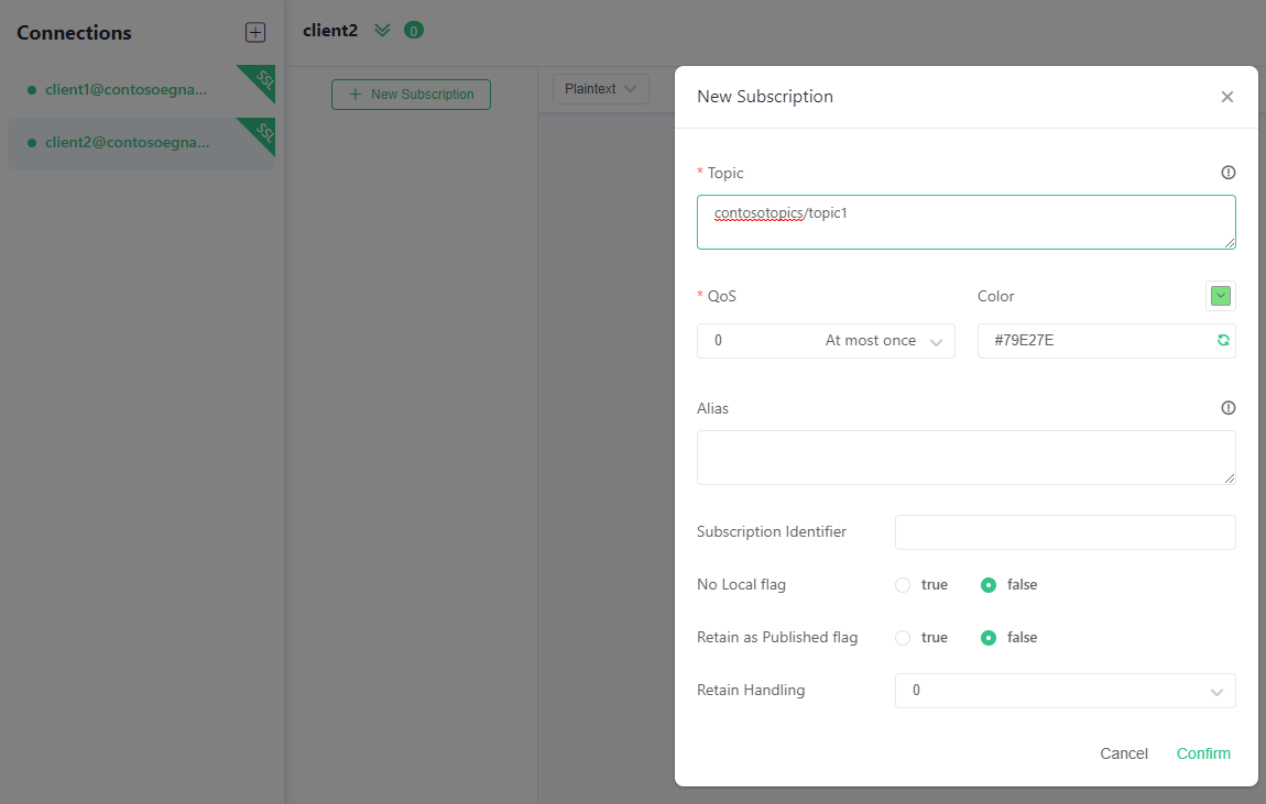 contosotopics/topic1come argomento e seleziona Conferma. È possibile lasciare gli altri campi con i valori predefiniti esistenti.Selezionare client1 nella barra sinistra.
