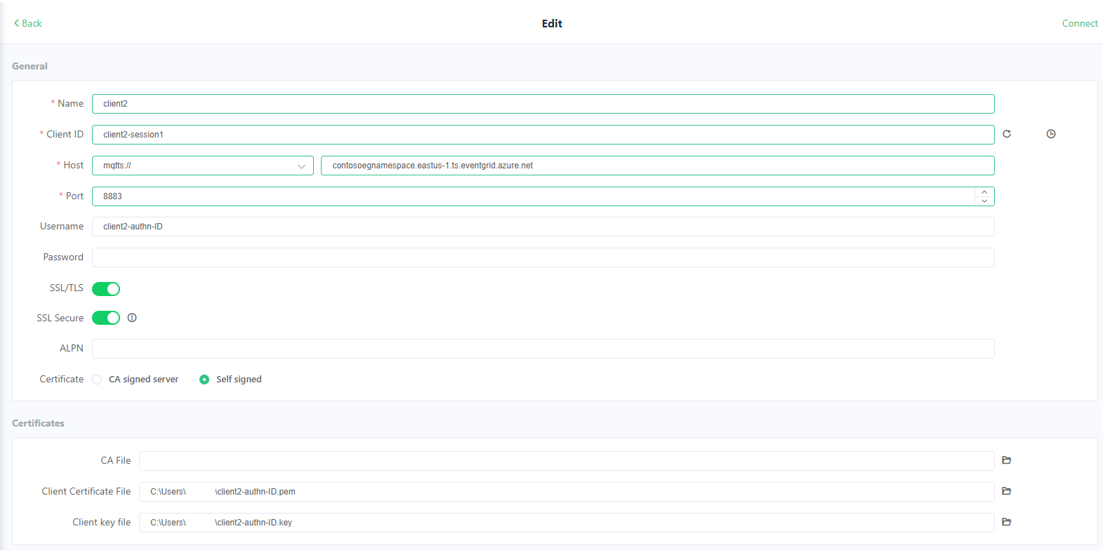 client1-authn-ID. È necessario includere questo nome comeUsernamenel pacchetto CONNECT.In questa esercitazione si usa l'autenticazione basata sull'identificazione personale. Includere l'identificazione personale del primo certificato client nell'identificazione personale primaria.