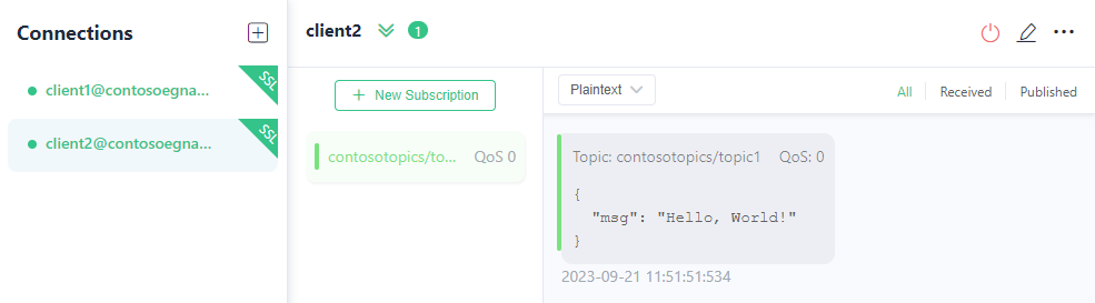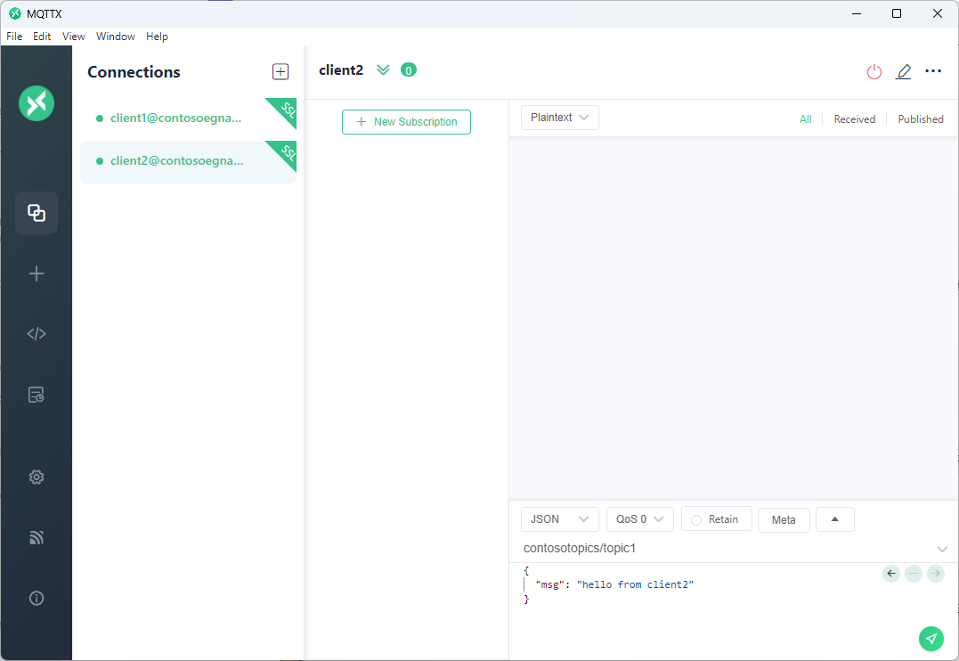 Dopo aver connesso i client, per client2, selezionare il pulsante + Nuova sottoscrizione .