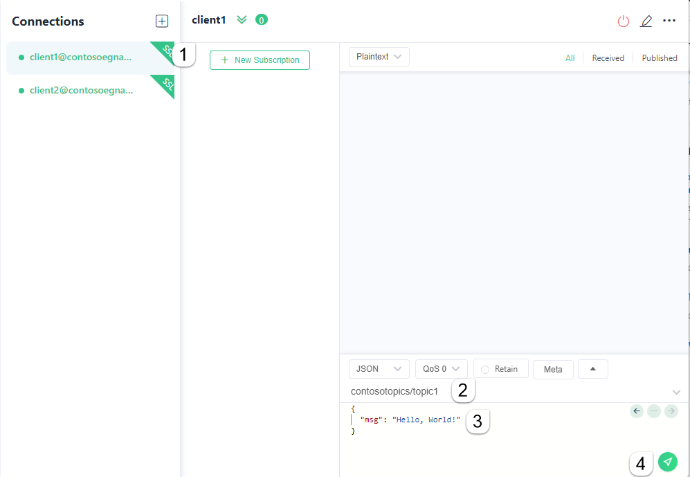 contosotopics/topic1come argomento in cui eseguire la pubblicazione.Comporre un messaggio. È possibile usare qualsiasi formato o JSON, come illustrato.