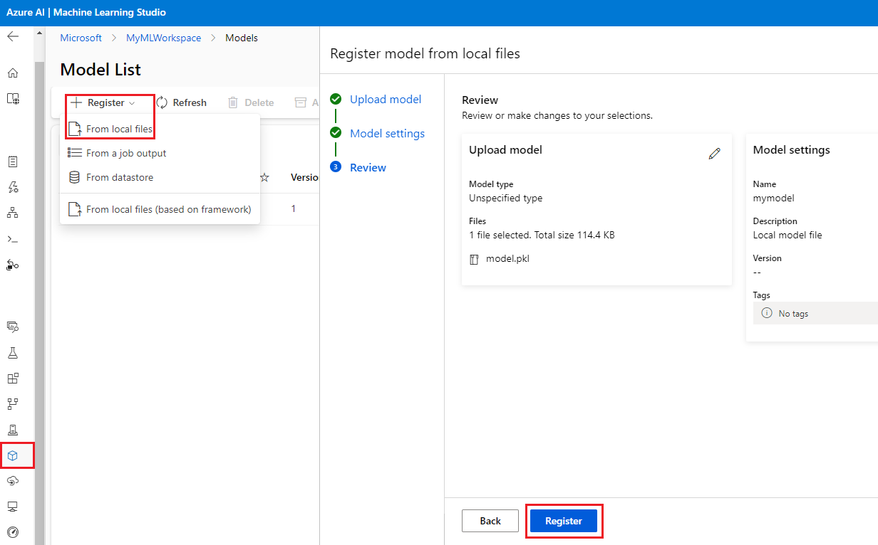 Per registrare un modello usando l'interfaccia utente di Studio di Azure Machine Learning: