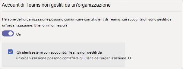 - Se si vuole consentire agli utenti esterni non gestiti di Teams di avviare la conversazione, selezionare la casella di controllo Gli utenti esterni con account di Teams non gestiti da un'organizzazione possono contattare gli utenti della mia organizzazione .
