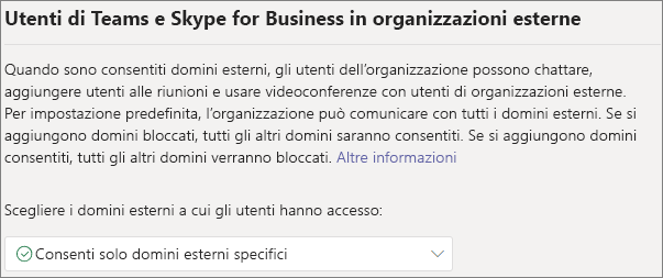 Per le riunioni e la chat con altre organizzazioni di Microsoft 365, è possibile specificare quali domini considerare attendibili. Per impostazione predefinita, sono consentiti tutti i domini esterni. È possibile consentire o bloccare determinati domini per definire quali organizzazioni sono attendibili per le riunioni esterne e la chat.