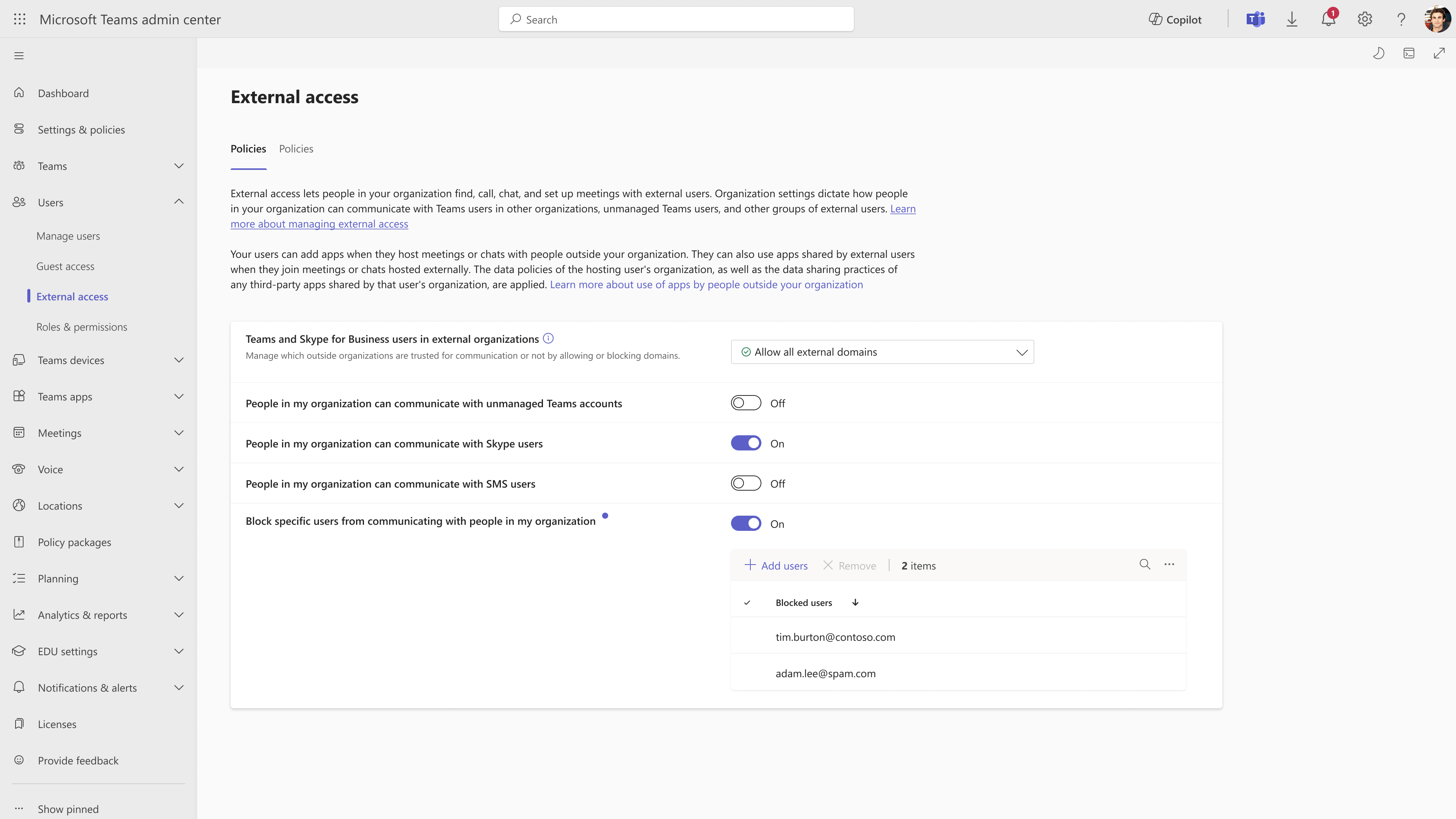 È possibile impedire a utenti esterni specifici di collaborare con l'organizzazione. Se un utente viene aggiunto all'elenco di blocchi, l'organizzazione non può avere 1:1 e chat di gruppo con questi utenti. Se le chat esistono già prima che un utente venga aggiunto all'elenco dei blocchi, l'utente bloccato viene rimosso dalla chat. Questa funzionalità è disattivata per impostazione predefinita.