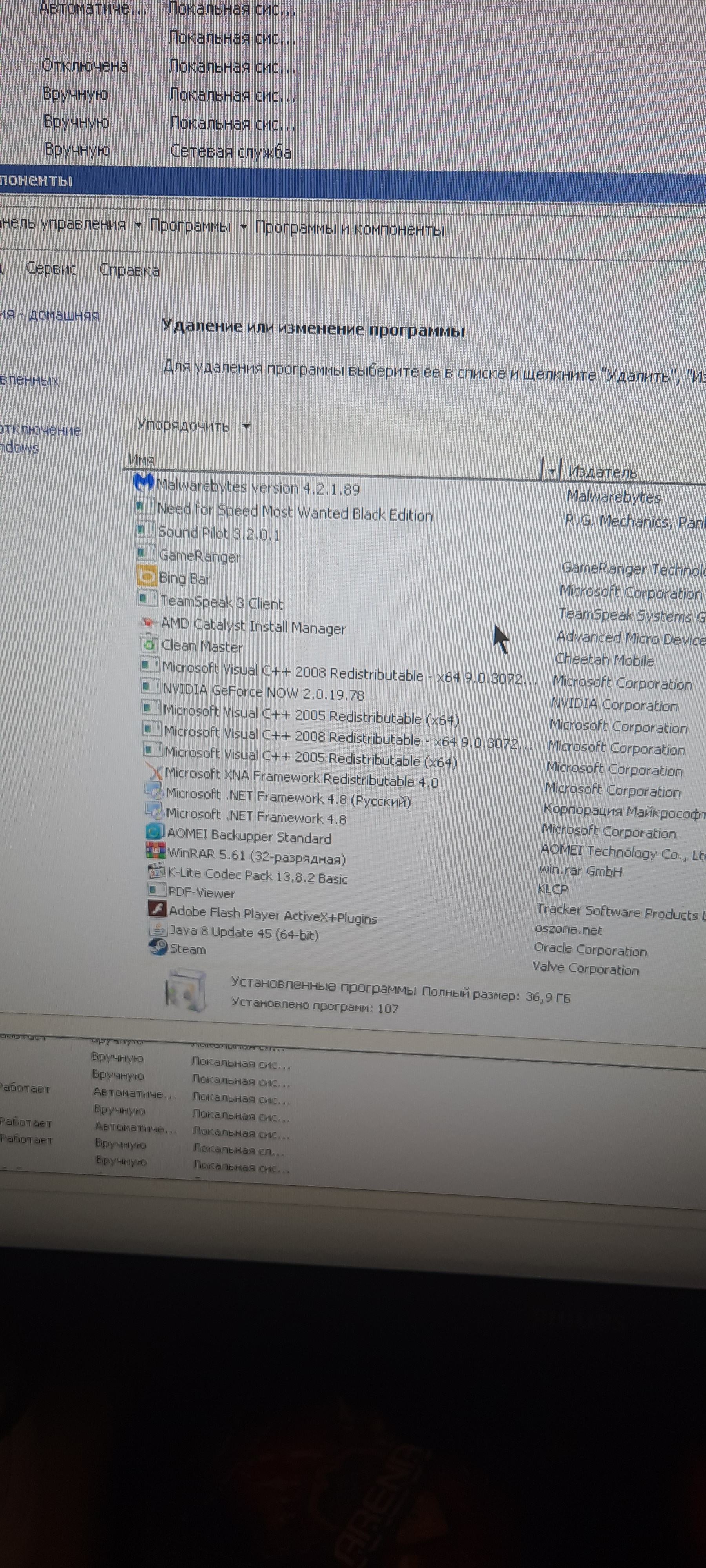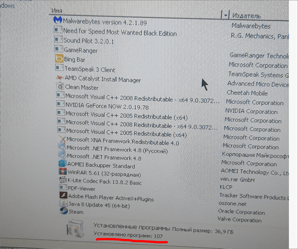 - Окна Панель управления-Программы и компоненты со списком всех установленных программ.