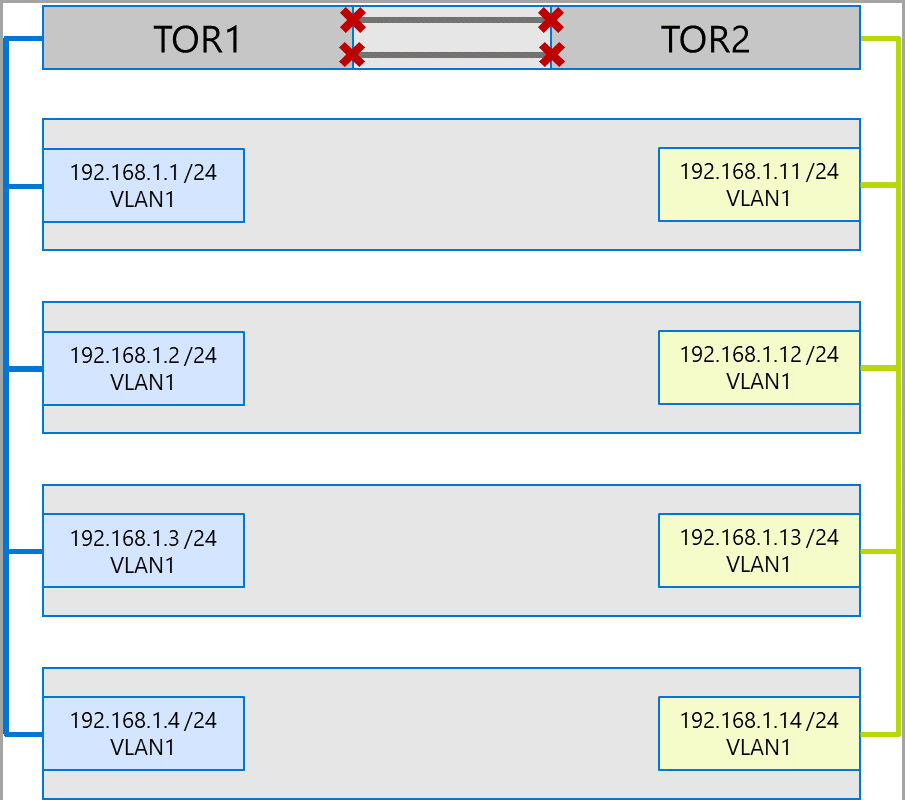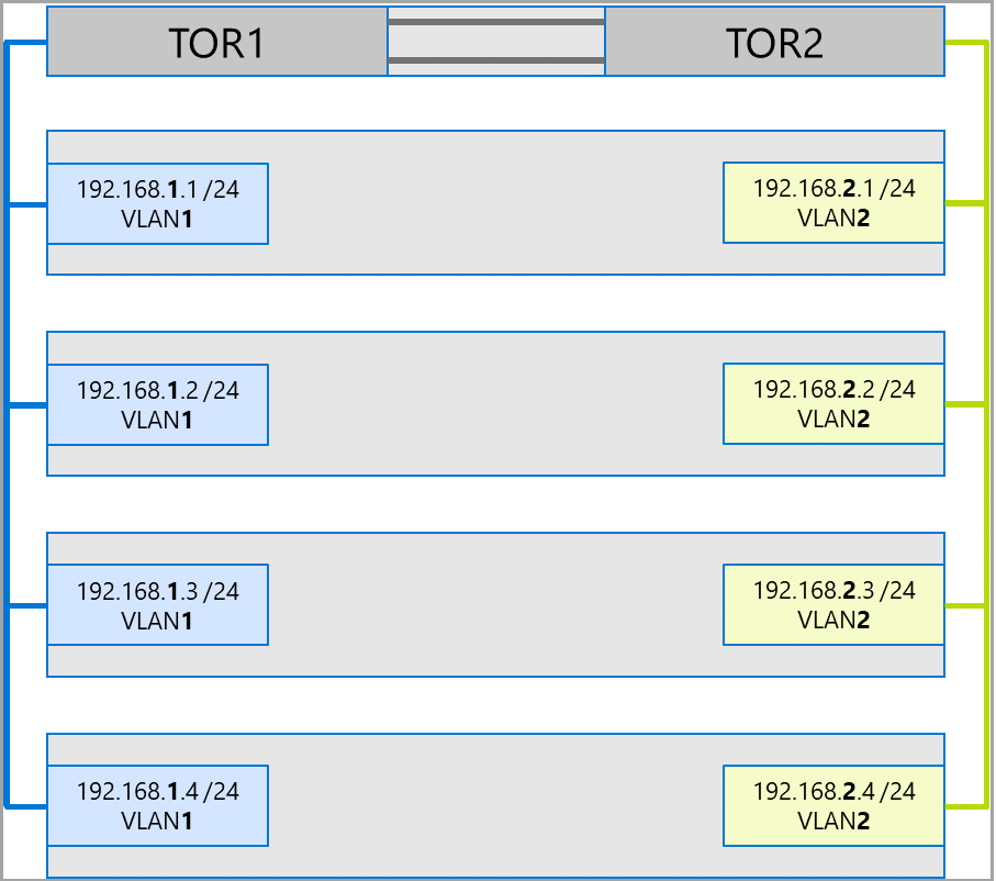 Рекомендуемый подход заключается в использовании отдельных подсетей и виртуальных ЛС для каждого набора адаптеров. На следующей схеме правые порты теперь используют подсеть 192.168.2.x /24 и VLAN2. Это позволяет трафику на левых портах оставаться в TOR1, а трафик на правых портах оставаться в TOR2.
