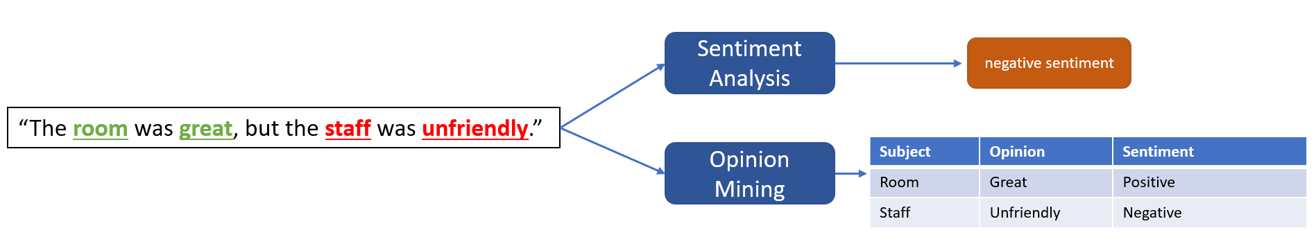 Например, если клиент оставляет отзыв о отеле, например "Комната была отличной, но персонал был несоответствующий"." Анализ мнений находит целевые объекты (аспекты) в тексте, а также их связанные оценки (мнения) и настроения. Анализ тональности может сообщать только об отрицательной тональности.