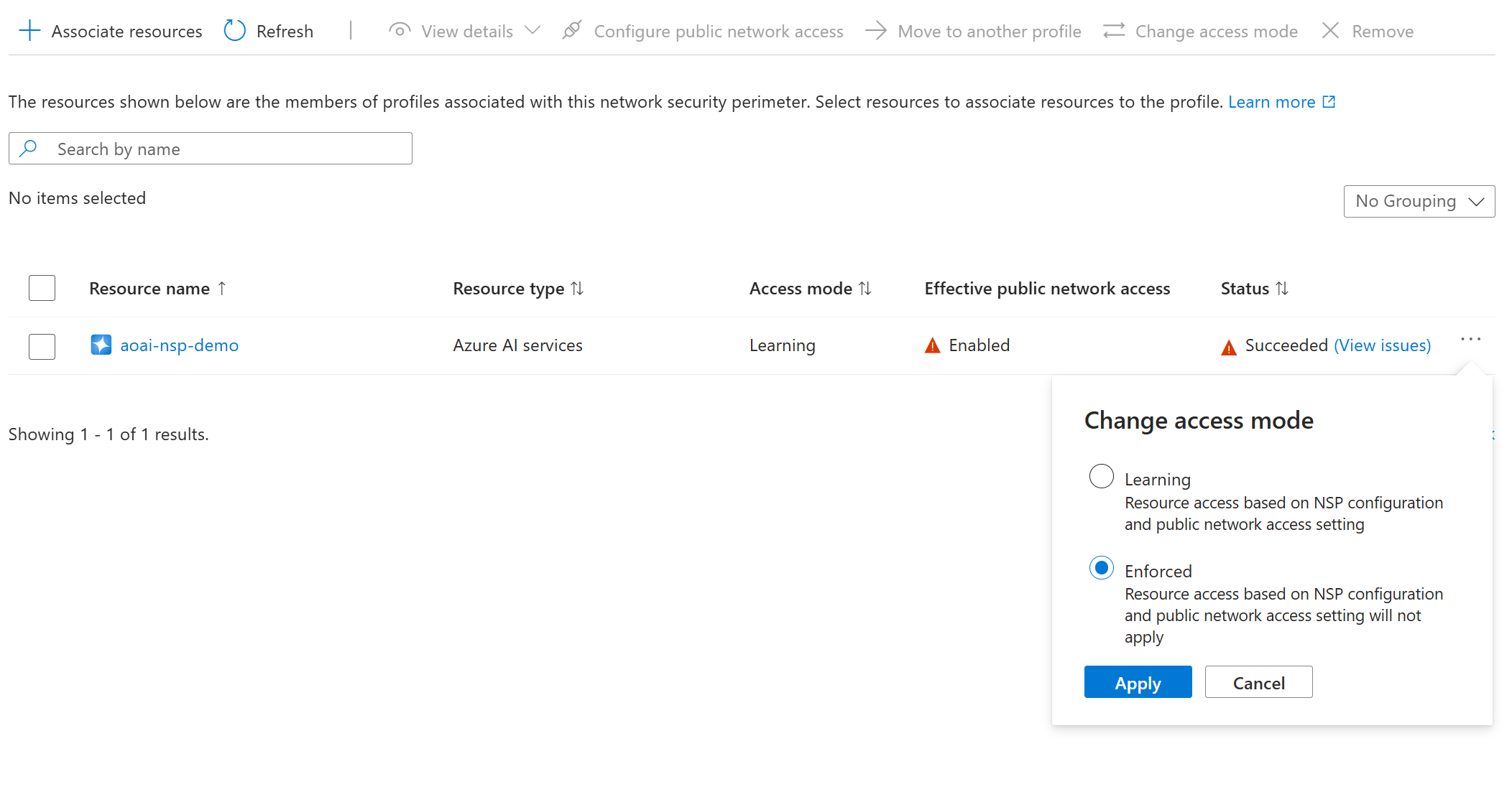 1. Измените ассоциацию периметра безопасности сети на включенный режим, чтобы начать применять требования периметра безопасности сети для доступа к вашей службе Azure OpenAI.