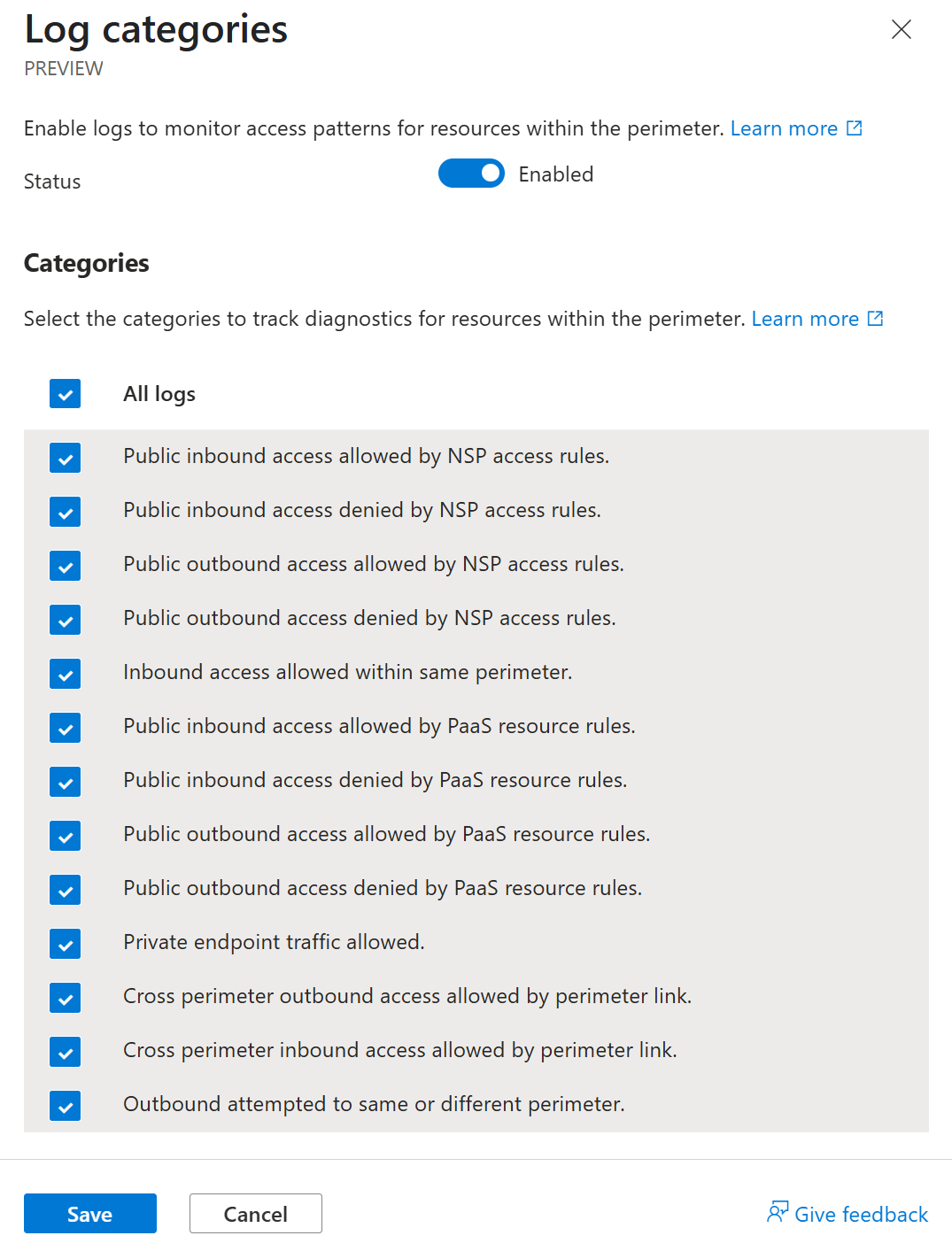 5. В разделе "Журналы" выберите allLogs. allLogs обеспечивает запись всего входного и исходящего сетевого доступа к ресурсам в периметре безопасности сети.