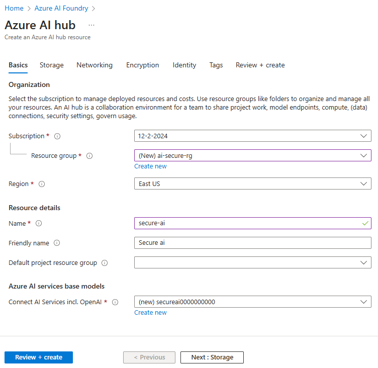 Foundry. В меню слева выберите центры ИИ, а затем нажмите кнопку "Создать " и "Центр".Введите данные о имени концентратора, подписке, группе ресурсов и расположении. Для базовых моделей средств Foundry выберите существующий ресурс служб ИИ или создайте новый. Средства Foundry включают несколько API-эндпоинтов для обработки речи, контроля безопасности контента и Azure OpenAI.