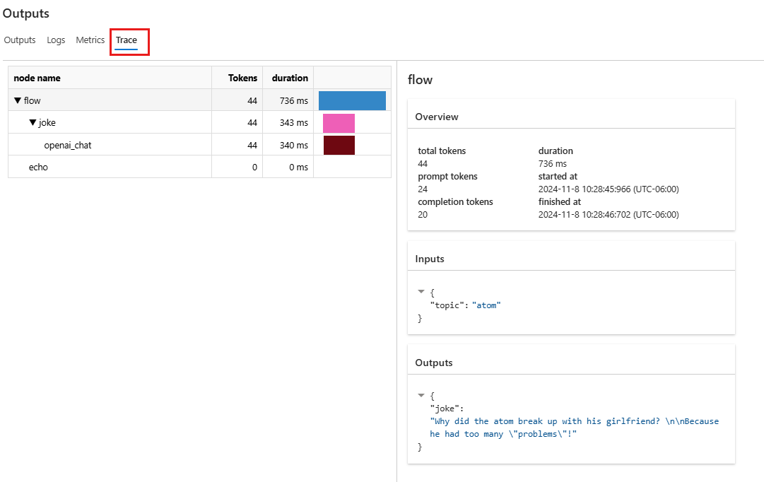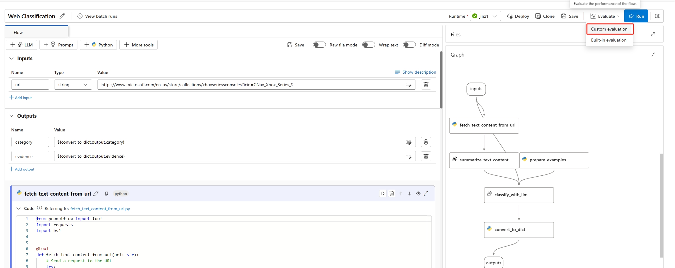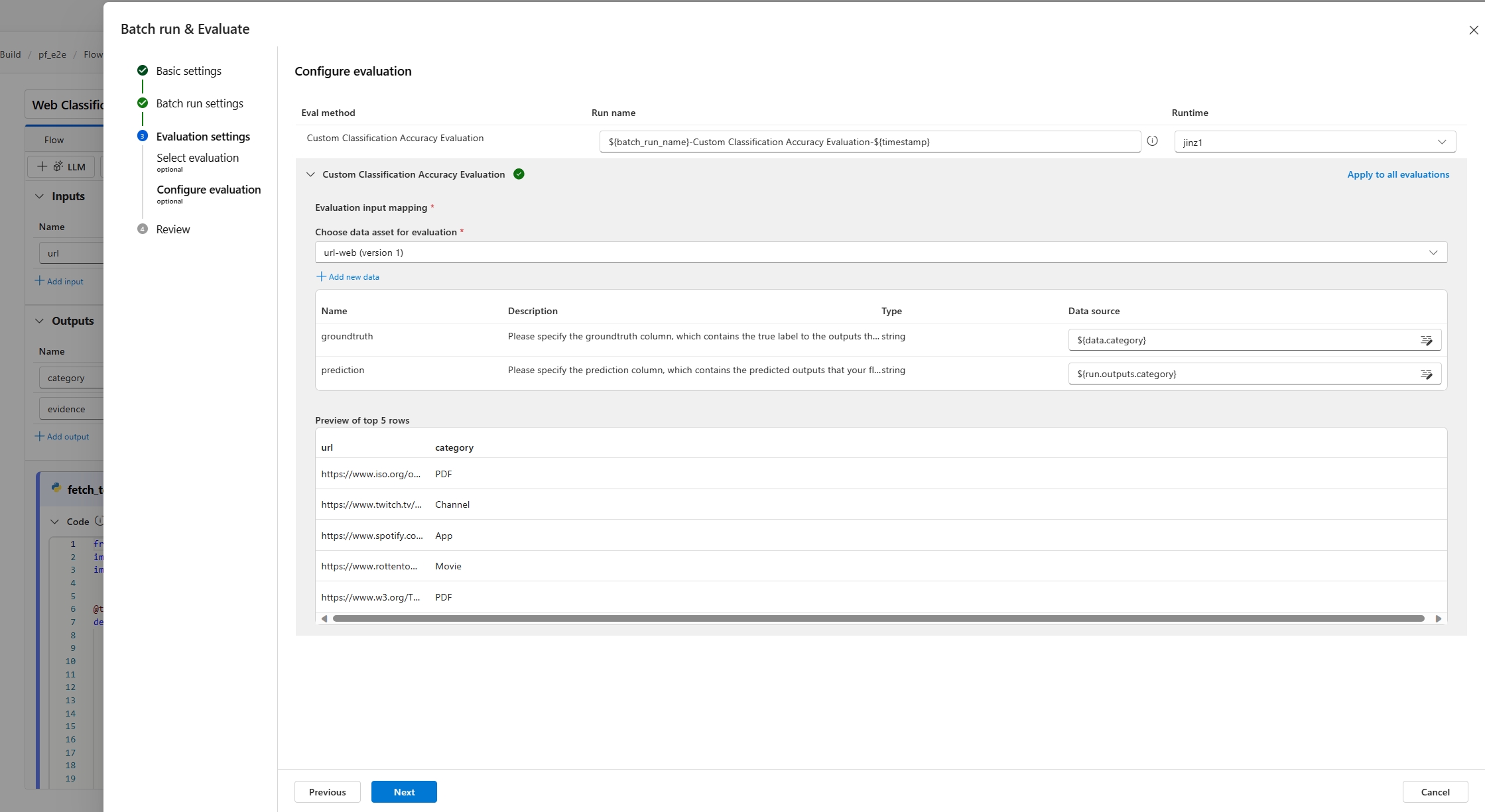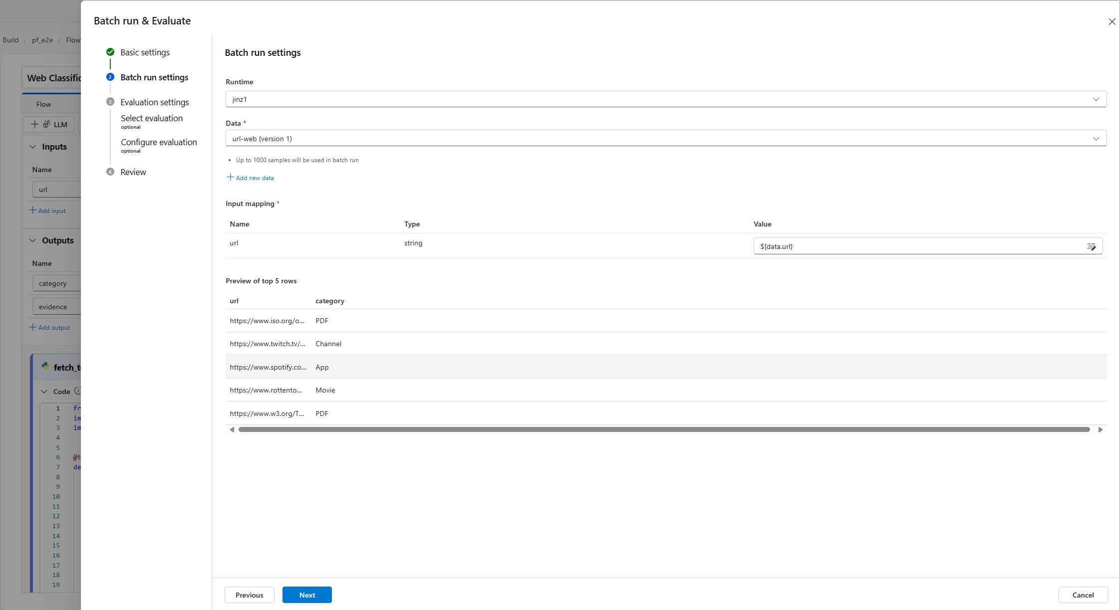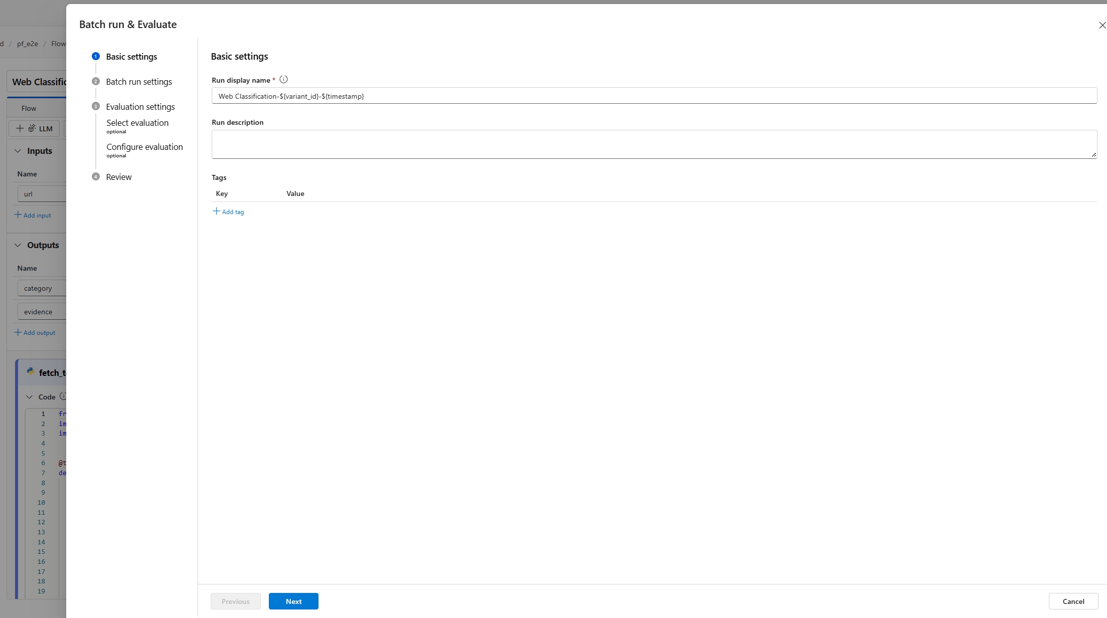 Пакетный запуск позволяет запускать поток с большим набором данных и создавать выходные данные для каждой строки данных. Вы также можете выбрать метод оценки для сравнения выходных данных потока с определенными критериями и целями. Метод оценки — это специальный тип потока , который вычисляет метрики для выходных данных потока на основе различных аспектов. Оценочный запуск выполняется для вычисления метрик, когда он отправляется с пакетной обработкой.