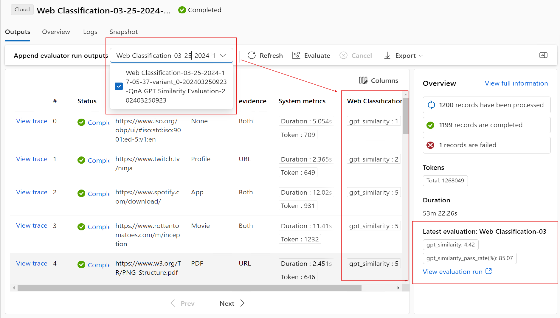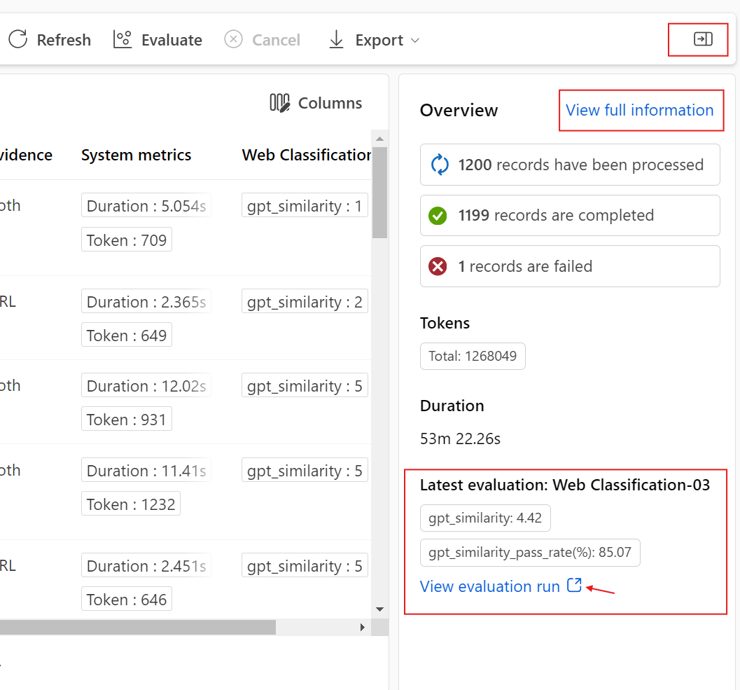 Последние агрегированные метрики запуска оценки отображаются здесь по умолчанию; вы можете выбрать опцию «Просмотр запуска оценки», чтобы перейти к просмотру самого запуска оценки.