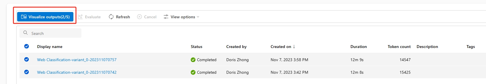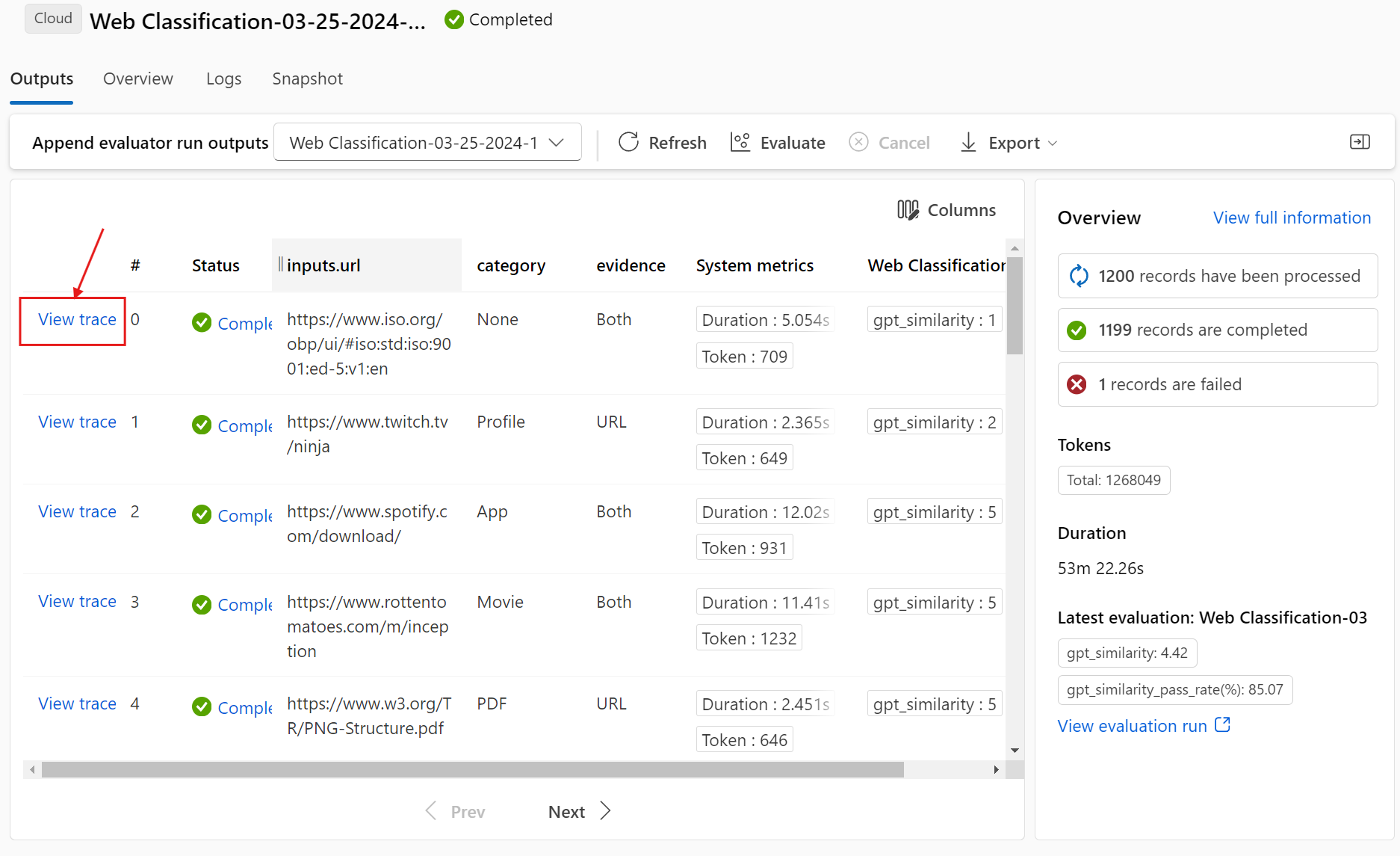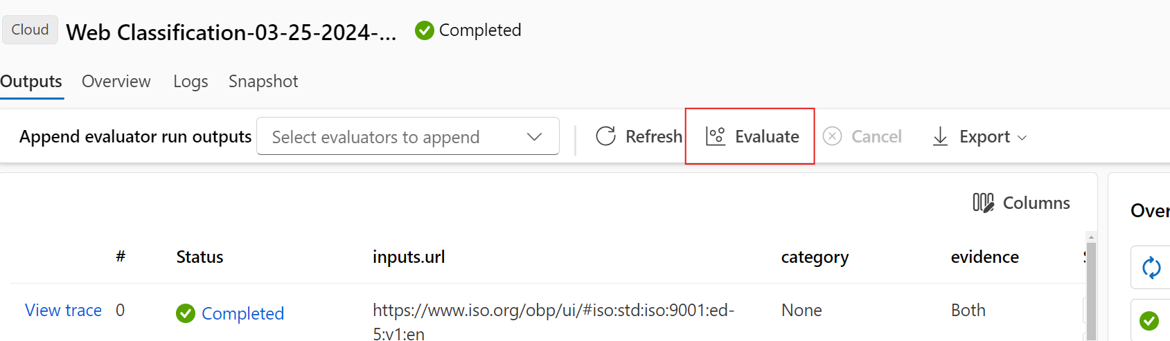 После настройки конфигурации можно выбрать "Отправить" для этого нового раунда оценки. После отправки вы сможете увидеть новую запись в списке выполнения потока запроса. После завершения выполнения оценки можно проверить результат оценки на вкладке "Выходные данные" панели сведений о пакетном запуске. Чтобы просмотреть результат, необходимо выбрать новый запуск оценки.