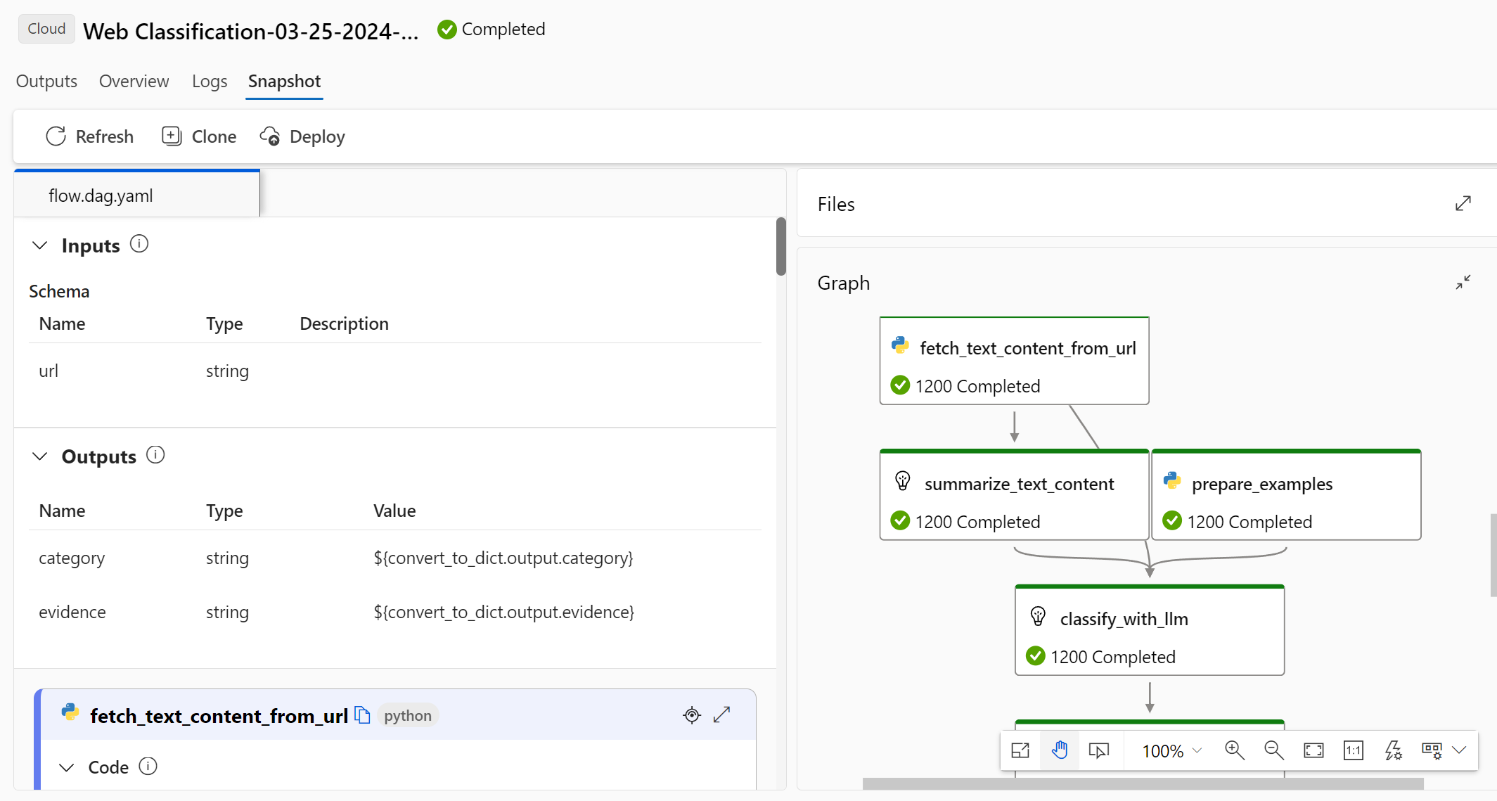 На вкладке "Моментальный снимок" можно увидеть снимок состояния запуска. Вы можете просмотреть DAG вашего потока. Кроме того, вы можете клонировать его для создания нового потока. Вы также можете развернуть его в качестве сетевой конечной точки.