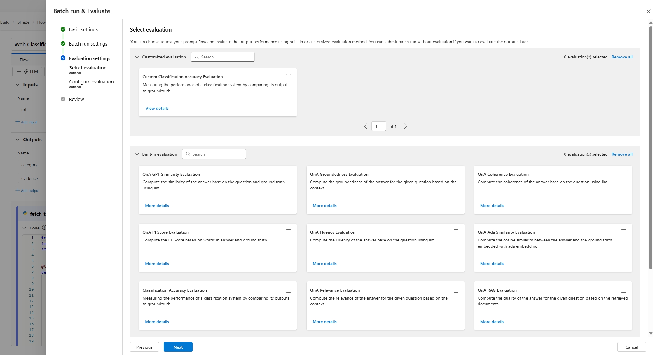 Затем на следующем шаге можно выбрать метод оценки для проверки производительности этого потока. Вы можете напрямую нажать кнопку "Далее ", чтобы пропустить этот шаг, если вы не хотите применить какой-либо метод оценки или вычислить какие-либо метрики. В противном случае, если вы хотите запустить пакетное выполнение с помощью оценки, можно выбрать один или несколько методов оценки. Оценка начинается после завершения пакетного запуска. Вы также можете запустить еще один раунд оценки после завершения пакетного запуска. Дополнительные сведения о том, как начать новый раунд оценки, см. в статье "Запуск нового раунда оценки".