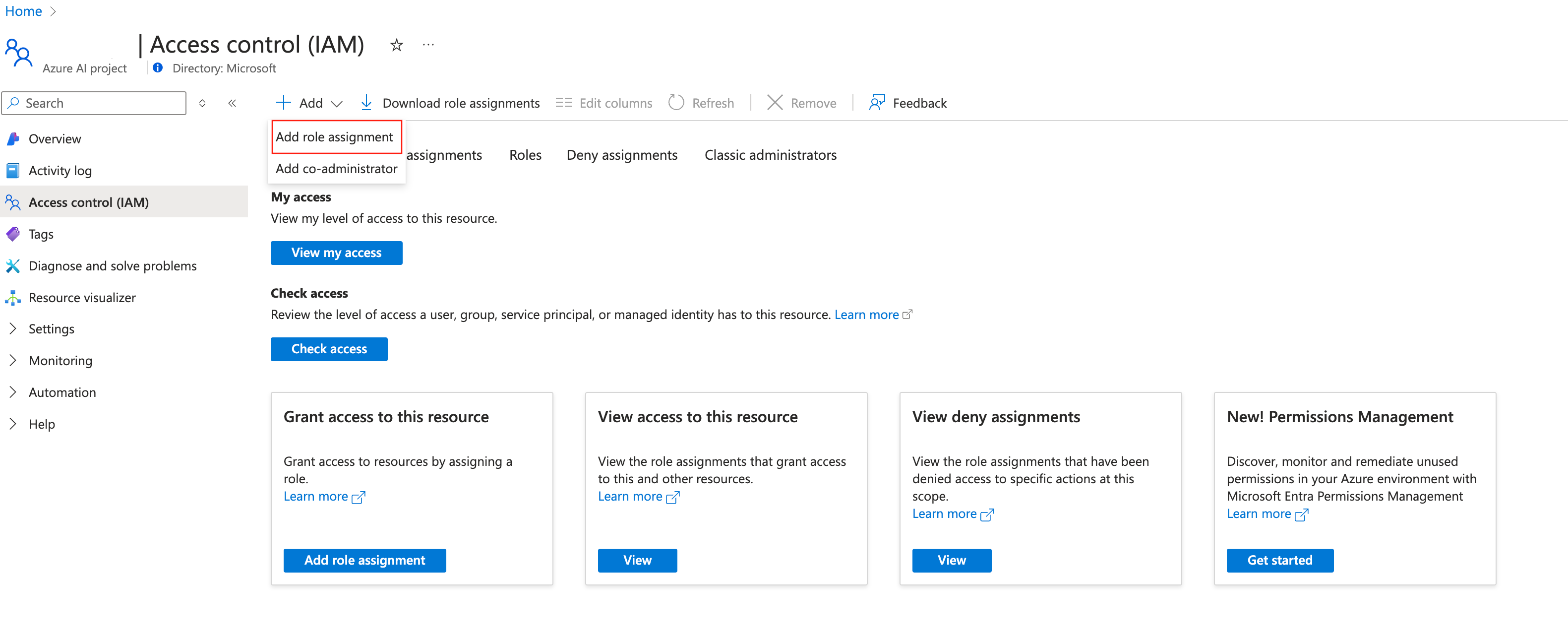 Только владелец ресурсов Azure может предоставить разрешения, добавив назначение роли. Возможно, вам потребуется обратиться к владельцу подписки Azure. Это может быть ИТ-администратор.