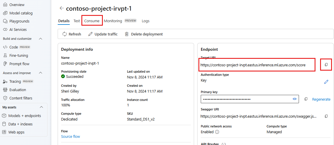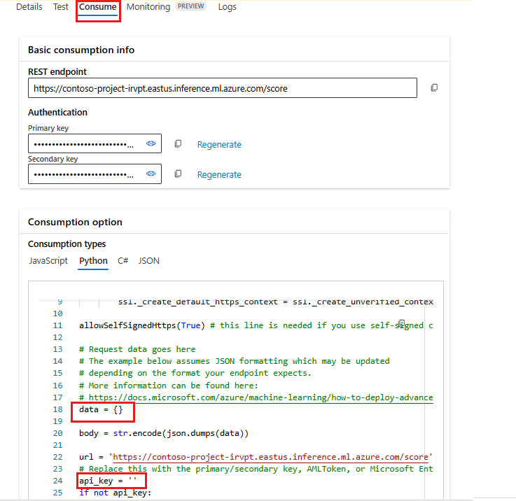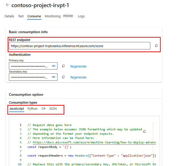 На странице сведений о развертывании выберите вкладку "Использование ". Вы можете найти конечную точку REST и ключ или токен для использования конечной точки. Пример кода также доступен для обращения к конечной точке на различных языках.
