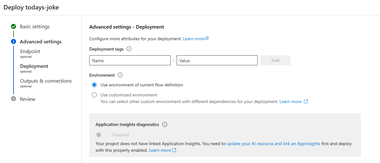 В рабочем процессе "Дополнительные параметры" можно также указать теги развертывания и выбрать настраиваемую среду.