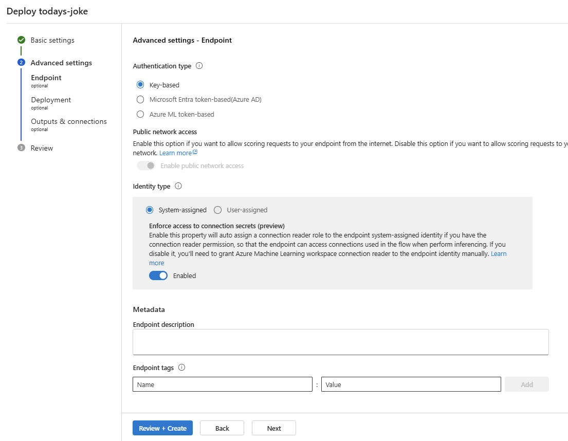 | Конечная точка | Выберите, хотите ли вы развернуть новую конечную точку или обновить существующую конечную точку. Если выбрать "Создать", необходимо указать имя конечной точки. |