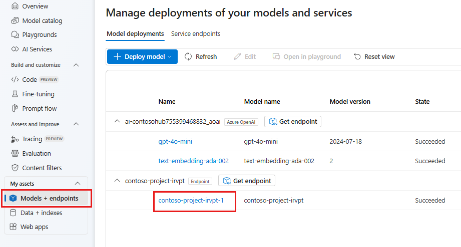 Чтобы просмотреть состояние развертывания, выберите "Модели + конечные точки " на левой панели. После того как развертывание будет успешно создано, выберите его, чтобы просмотреть дополнительные сведения.
